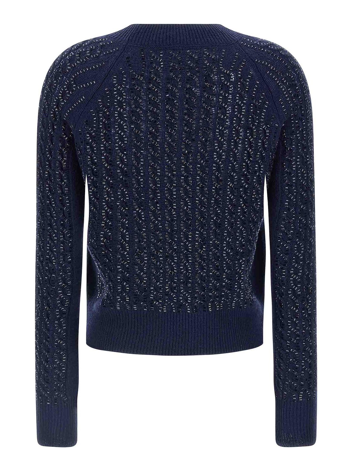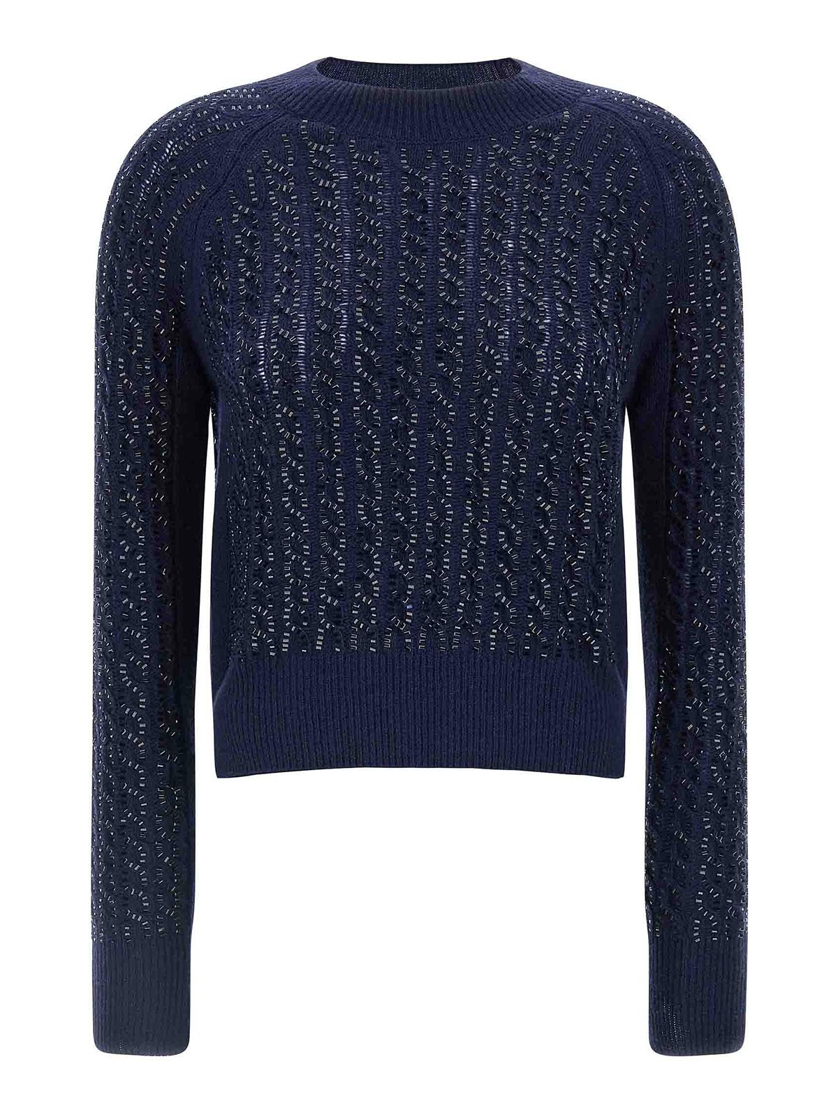 バージンウールとカシミヤの混紡セーター。全体にバゲットスタッズ、クルーネック、ロングカフスリーブをあしらった編み込みニット。
