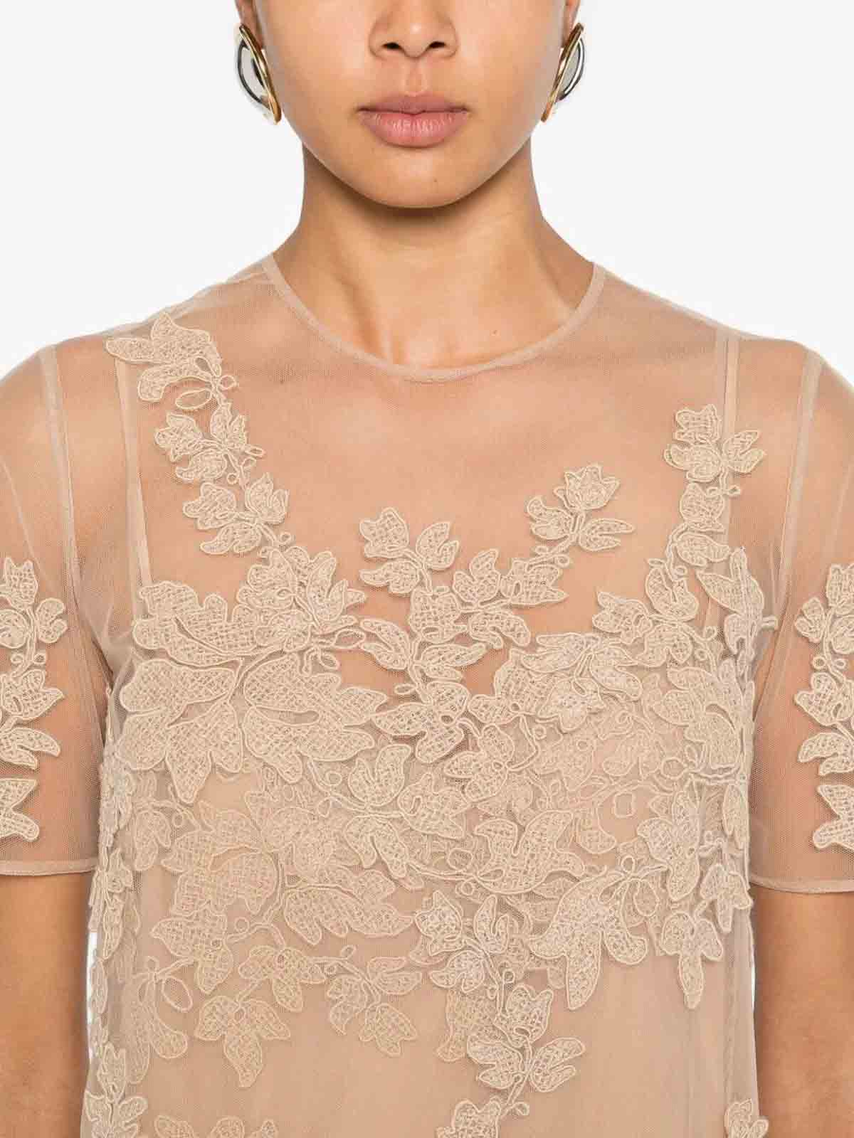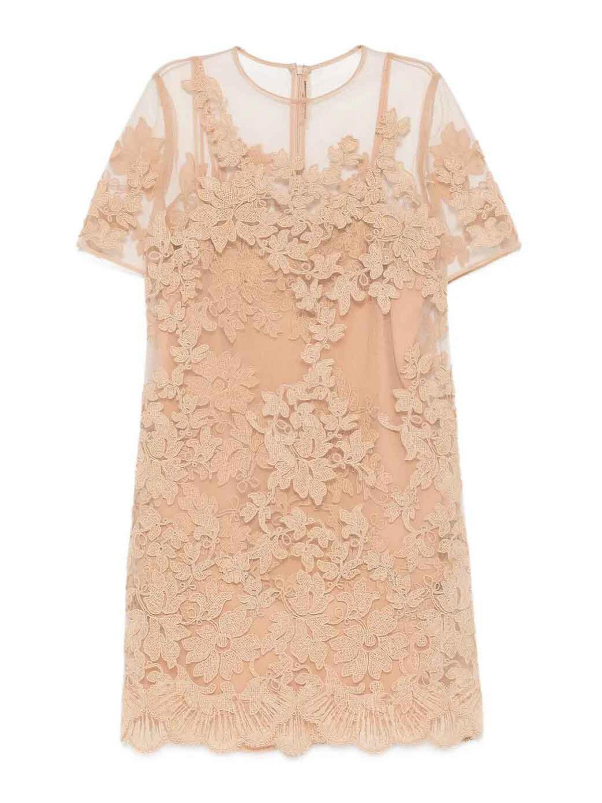ベージュの花柄レース、裾はスカラップ、半袖、ラウンドネック、ファスナー