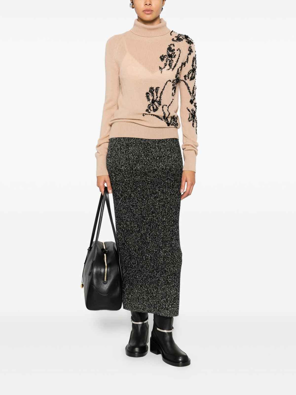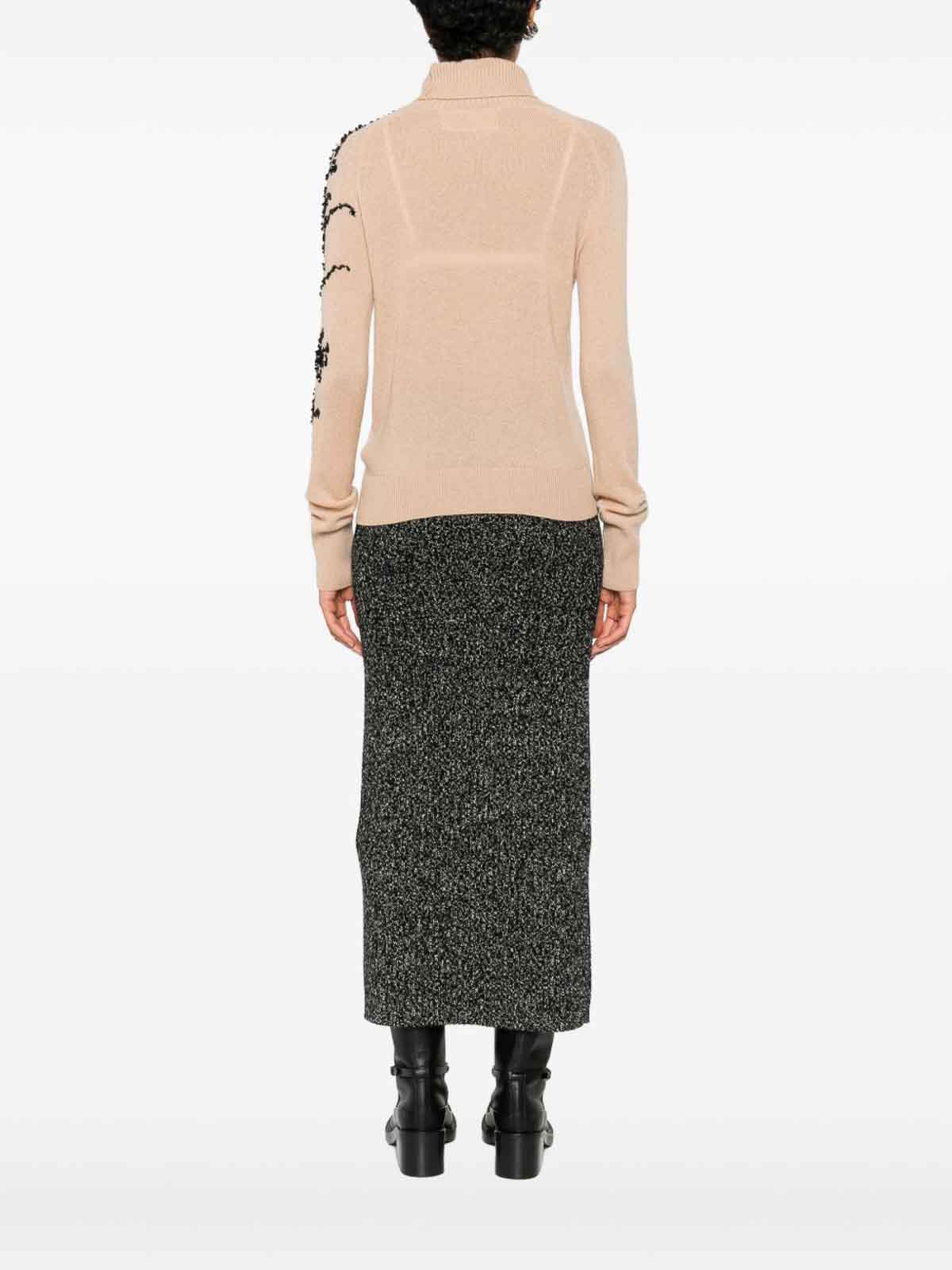 ライトブラウン花柄装飾ロールネック長袖リブ付きトリム