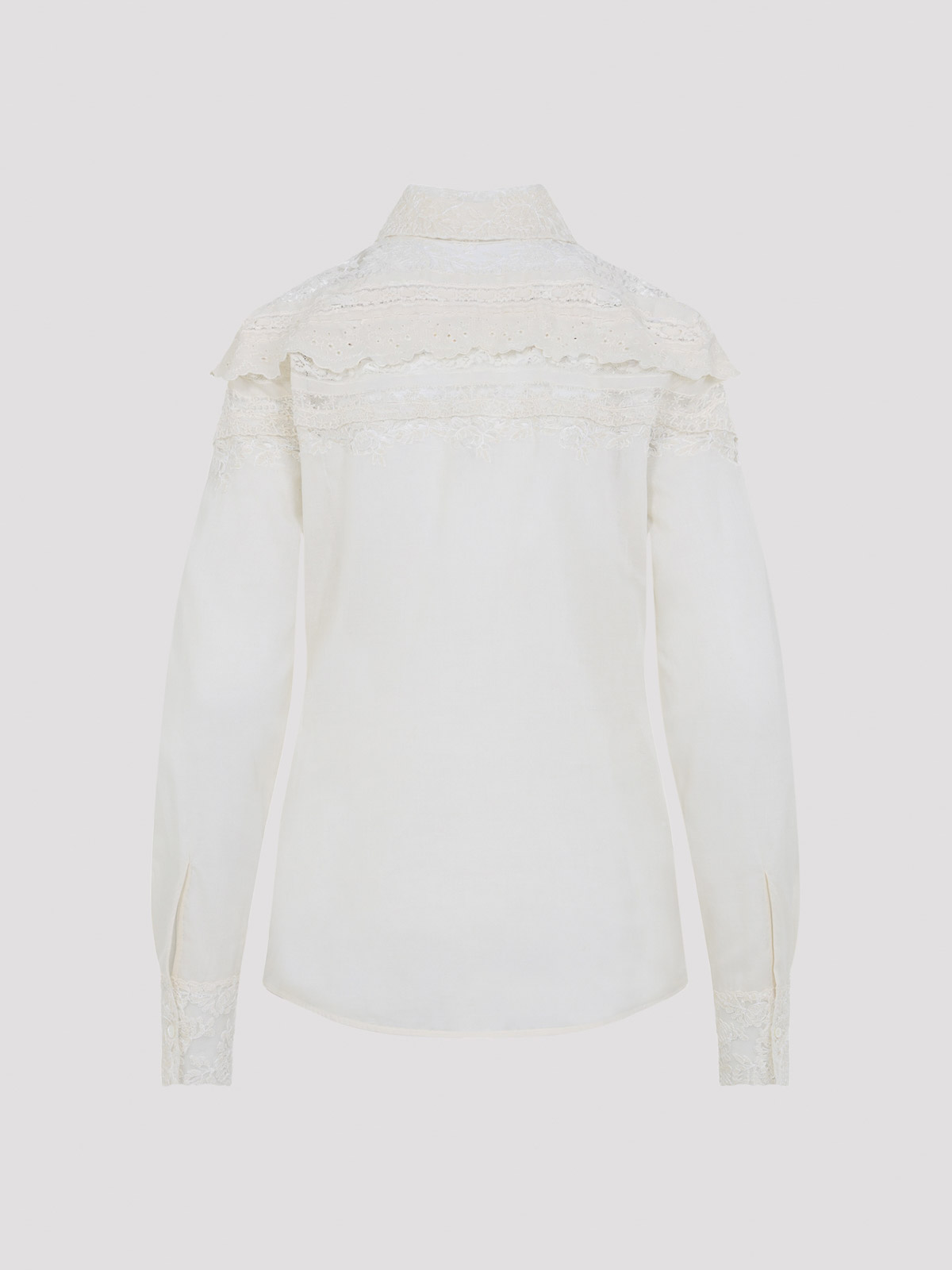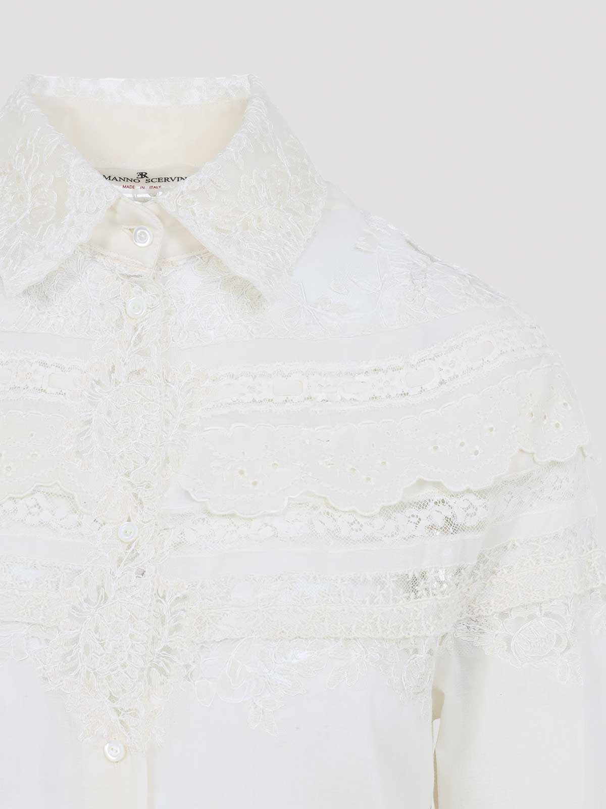 Ermanno scervino ホワイトコットンシャツ。レースとフリルのディテールが施された白いコットン製で、先のとがった襟、フロントボタン留め、ボタン付きカフス付きの長袖、丸みを帯びた裾が特徴です。