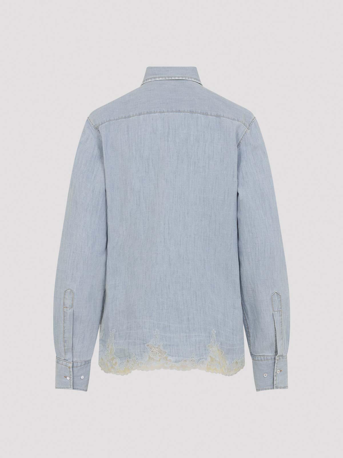 Ermanno scervino ライトブルーのコットンとリネンのシャツ。ライトブルーのコットンとリネンの混紡素材で作られており、ポインテッドカラー、フロントレースのディテール、フロントボタン留め、ボタン付きカフス付きロングスリーブ、バックヨーク、スカラップヘムが特徴です。