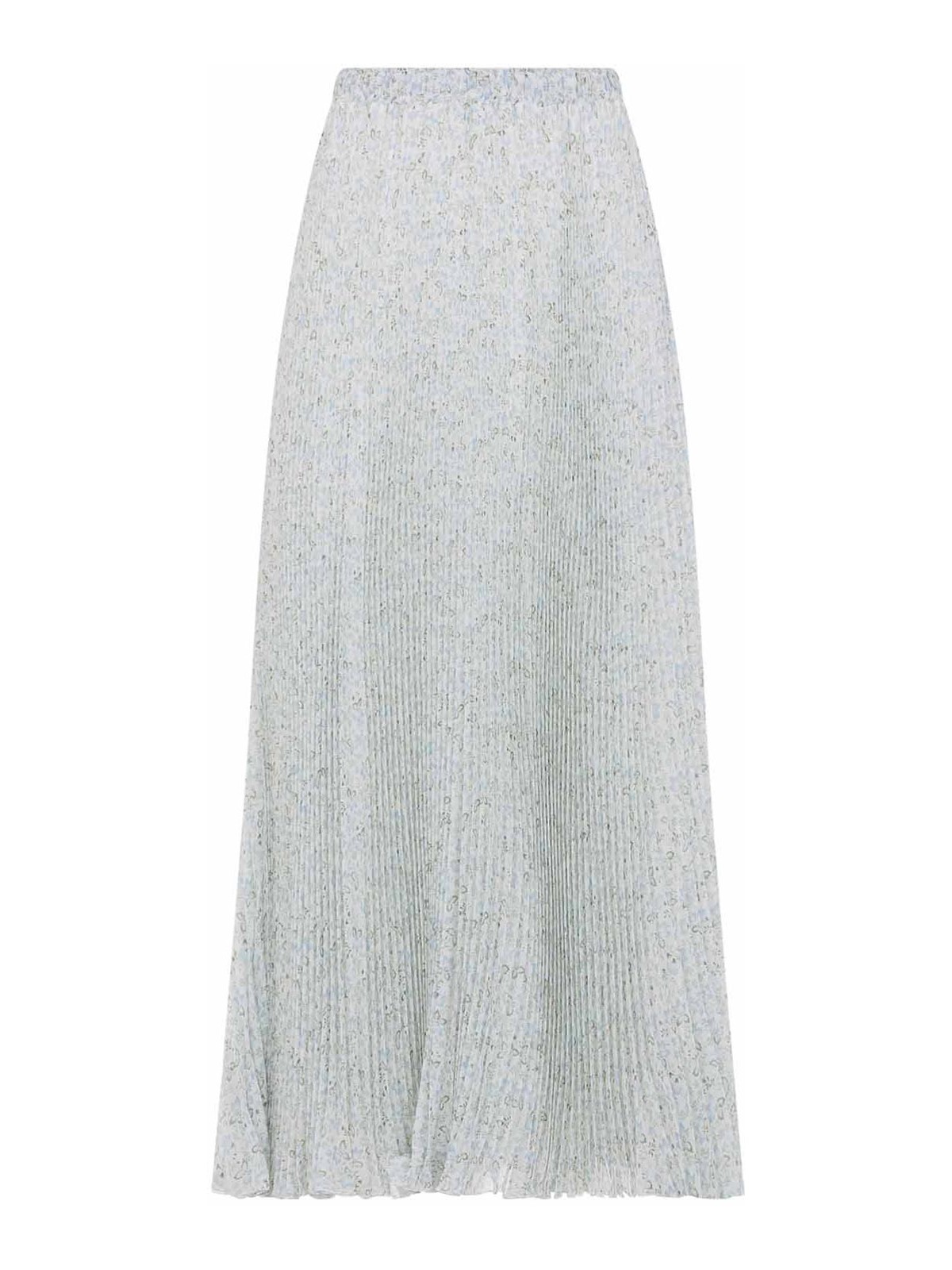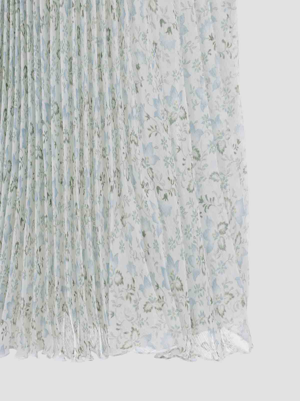 Ermanno scervino plisseプリントの白いシルクのミディスカート。全体に花柄のプリントが施された白いシルク製のフルプリーツミディスカートで、ウエストバンドとストレートヘムが特徴です。