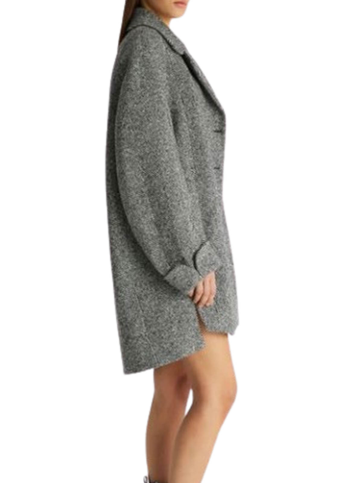 ブラックホワイトバージンウール混紡ヘリンボーン柄プリントクラシックラペルショルダーパッドカフ付きヘム両サイドウェルトポケットアシンメトリーヘムフルライニングフロントクロージャー