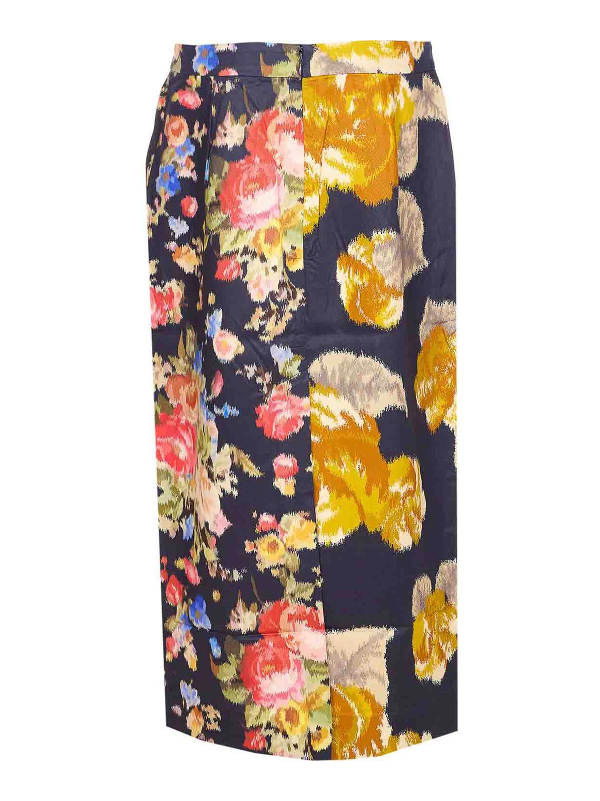 Essentiel antwerp マルチカラージョンシースカート、背面にファスナーとフック留め、花柄、横ポケット、ミディモデル、背面にスプリット