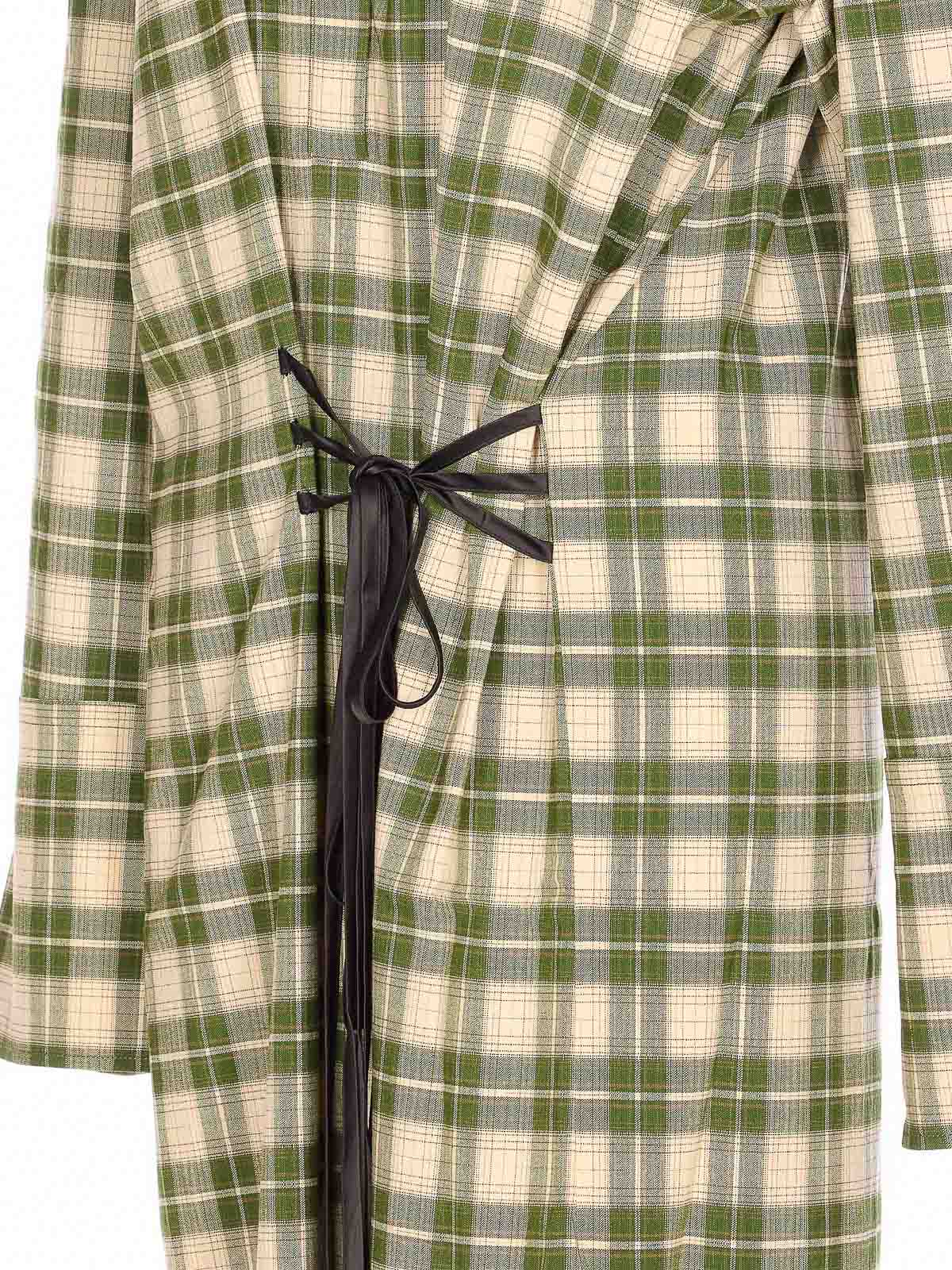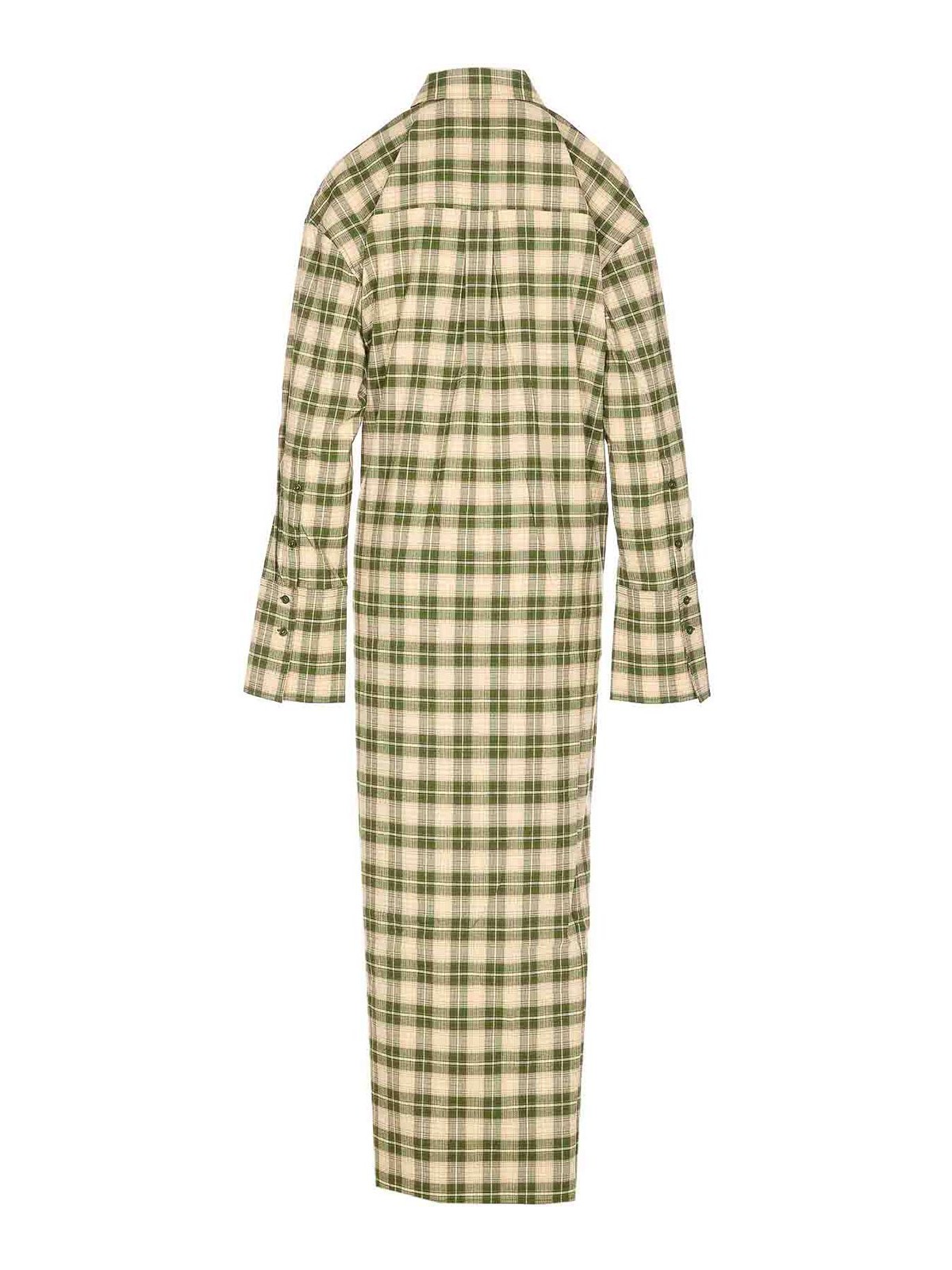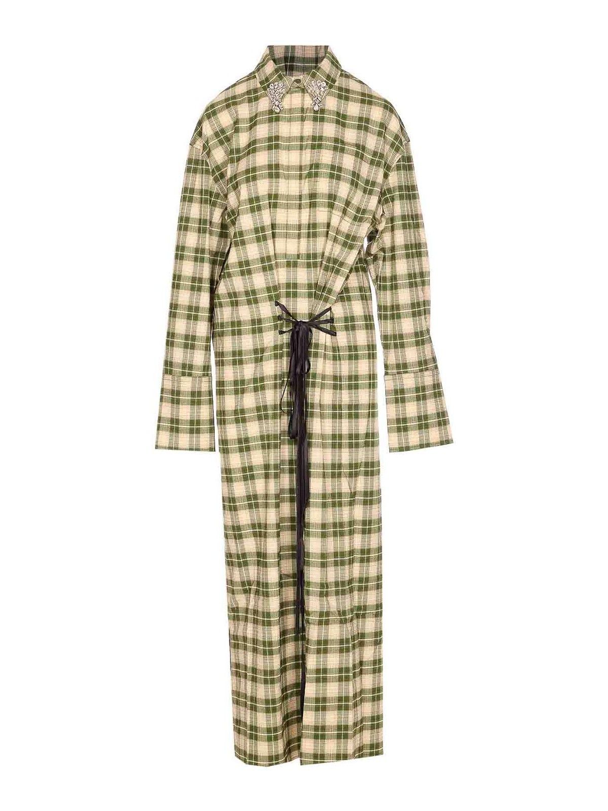 Essentiel アントワープグリーンミッドシャツドレス、ボタン留め、アプリケーションクリスタルのディテールが施されたレギュラーカラー、ボタン留め、長袖、袖口にボタン、ウエストにクーリス、フロントにポケット、チェックモチーフ