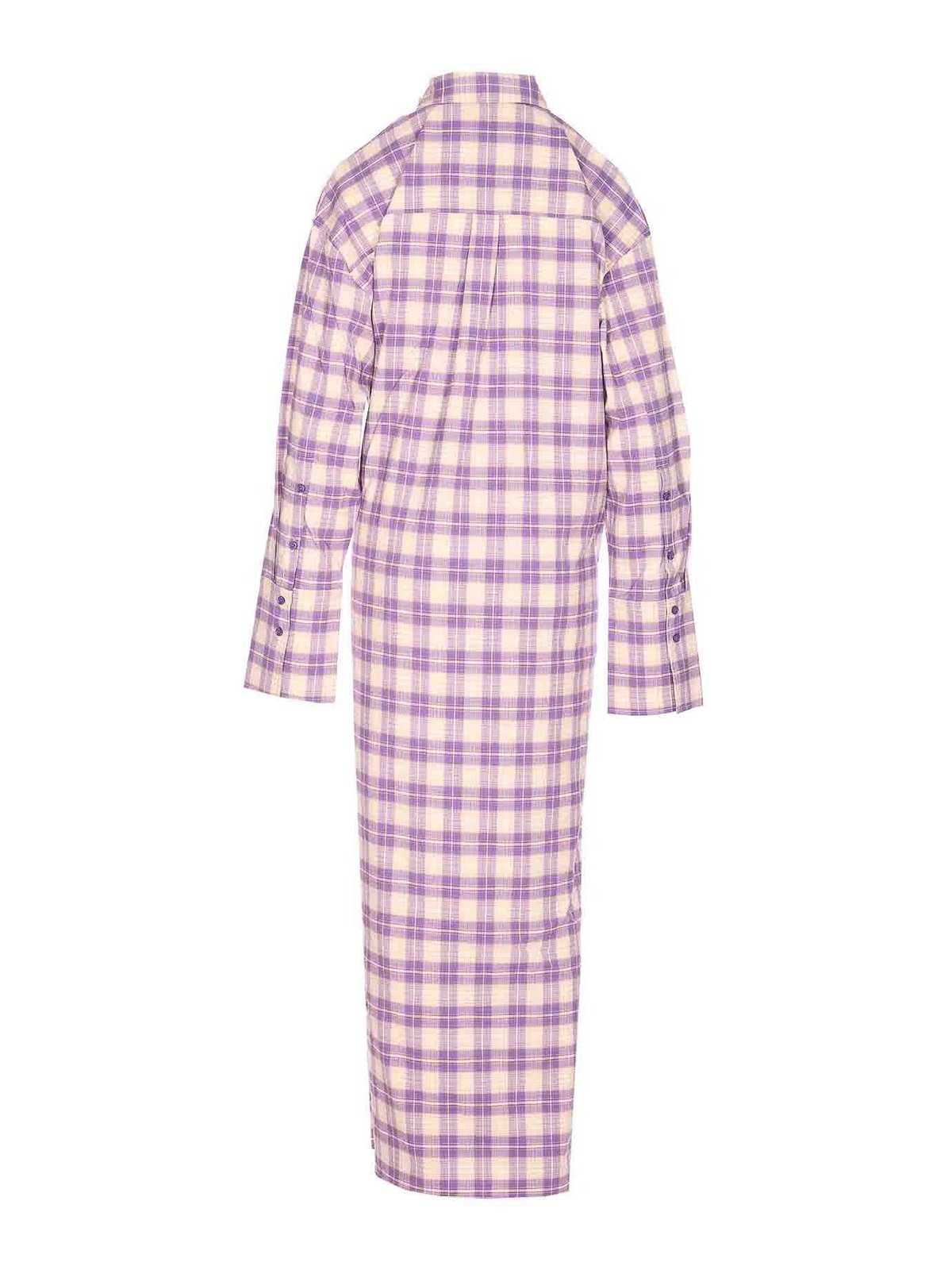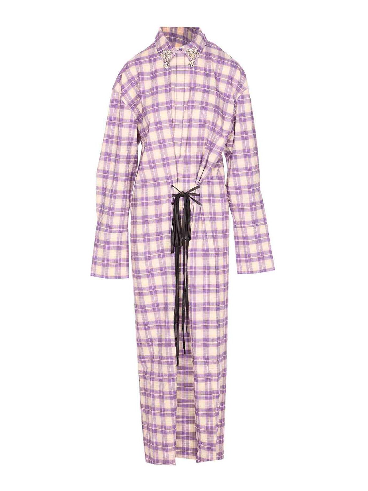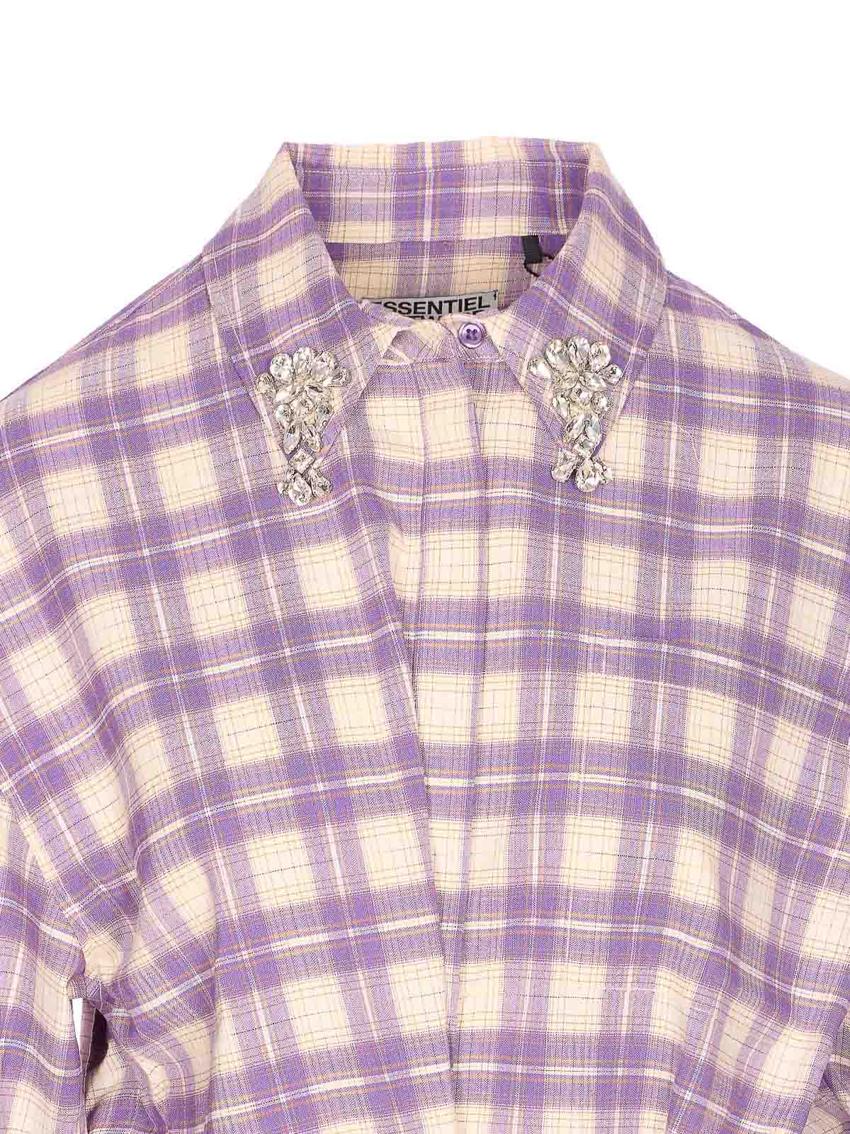 Essentiel antwerp パープルミッドシャツドレス、ボタン留め、アプリケーションクリスタルのディテールが施されたレギュラーカラー、ボタン留め、長袖、袖口にボタン、ウエストにクーリス、フロントにポケット、チェックモチーフ