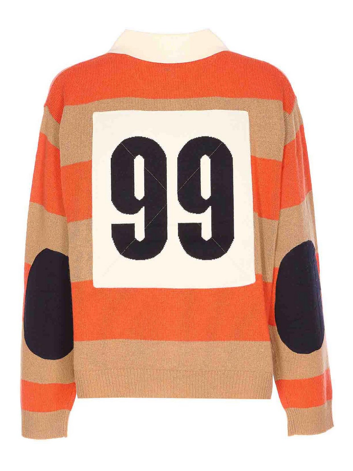 Essentiel antwerp オレンジとベージュのジャーンストライプ、フロントにボタン、ロングスリーブ、レギュラーカラー、バックにパッチロゴ