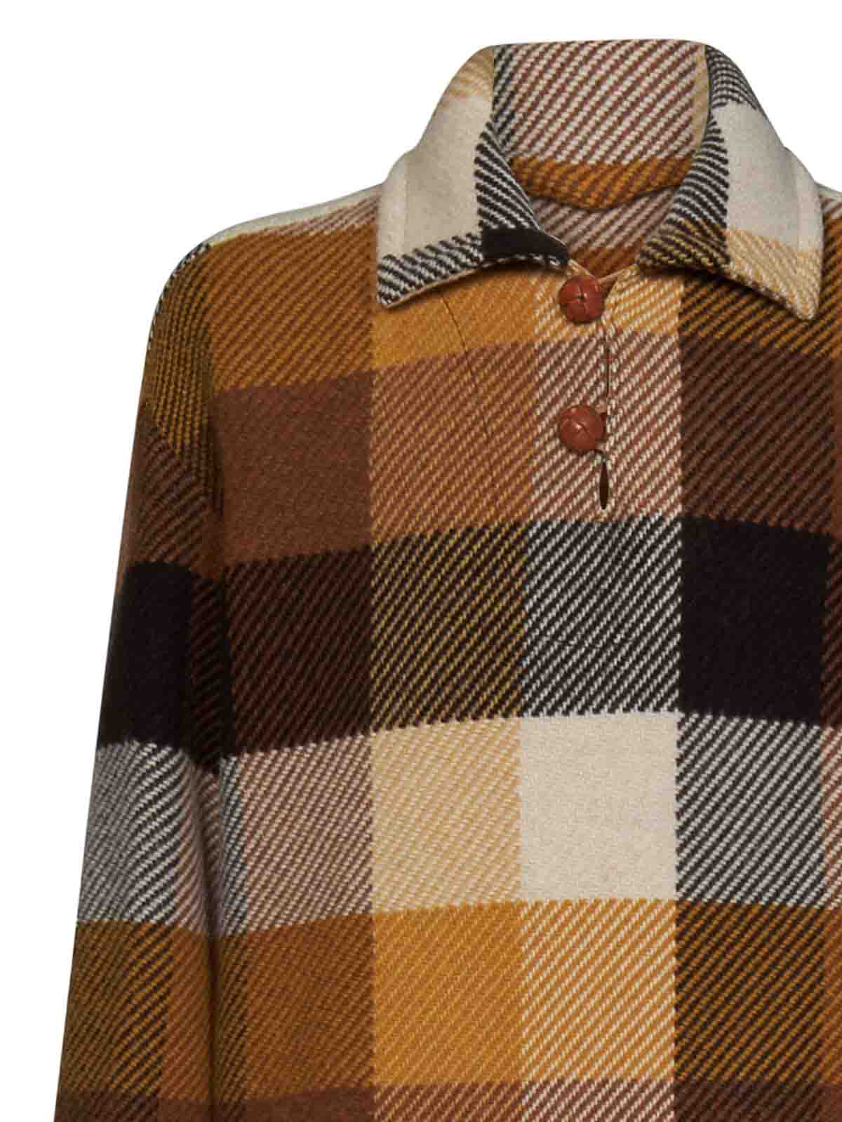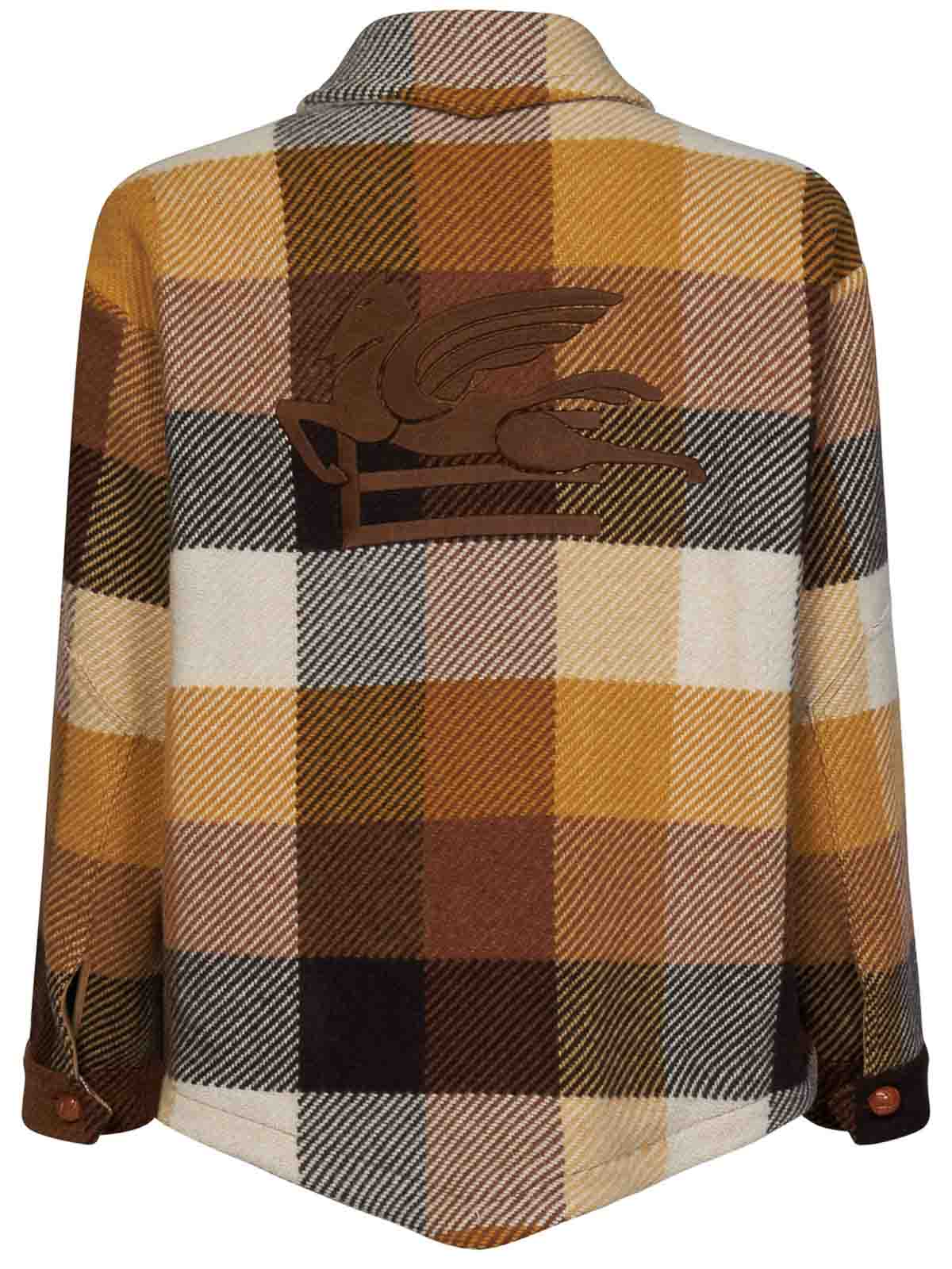 プルオンボタン2ボタンシャツ襟長袖、ワンボタンカフス、ソフトショルダー、ブラウンのDエフェクト糸、後ろにエトロロゴとペガソの刺繍、後ろに尖ったヘム、全面にグラデーション効果のマルチカラーチェック柄の編み込みボタン、写真のベージュはMに対応