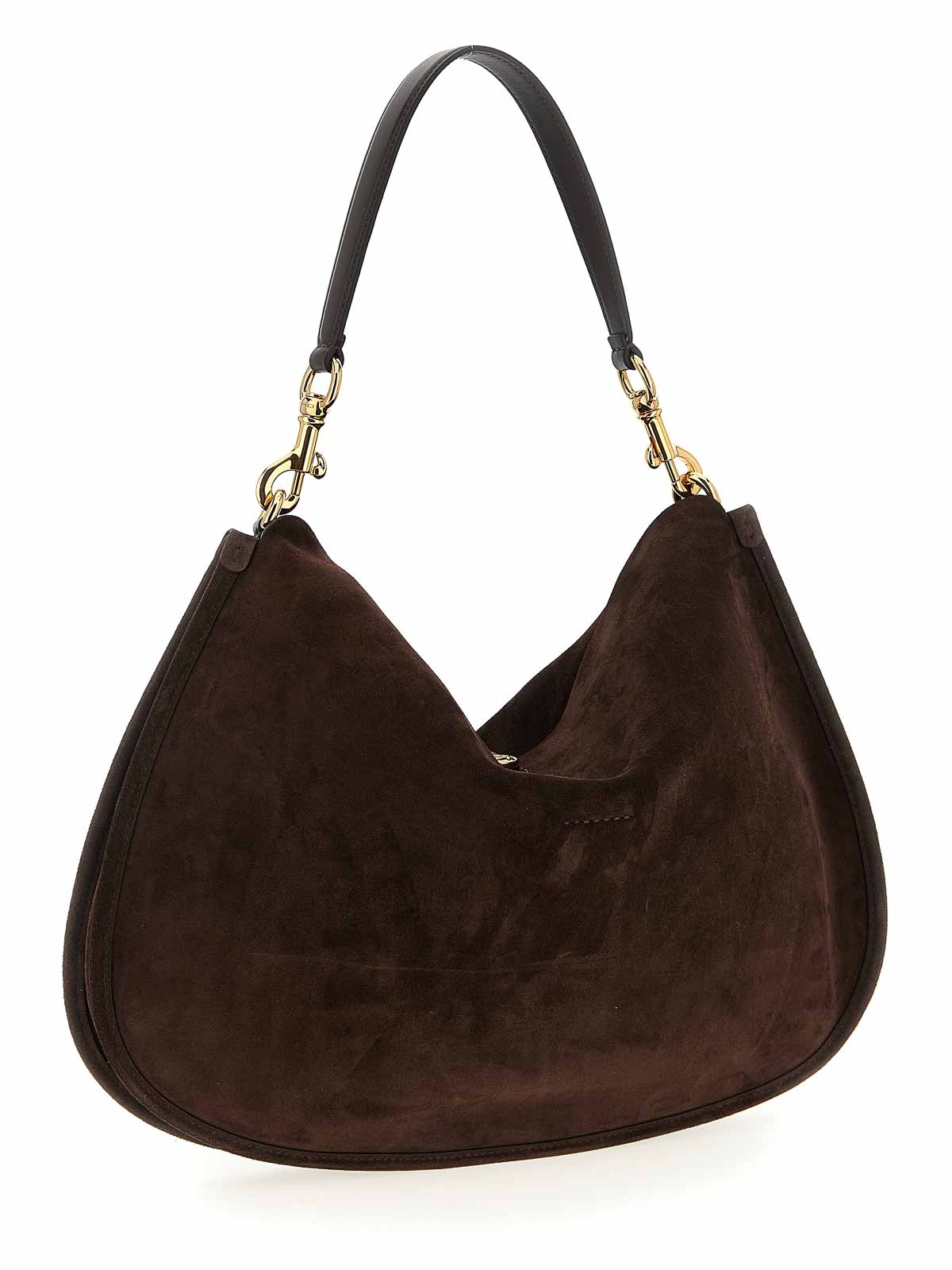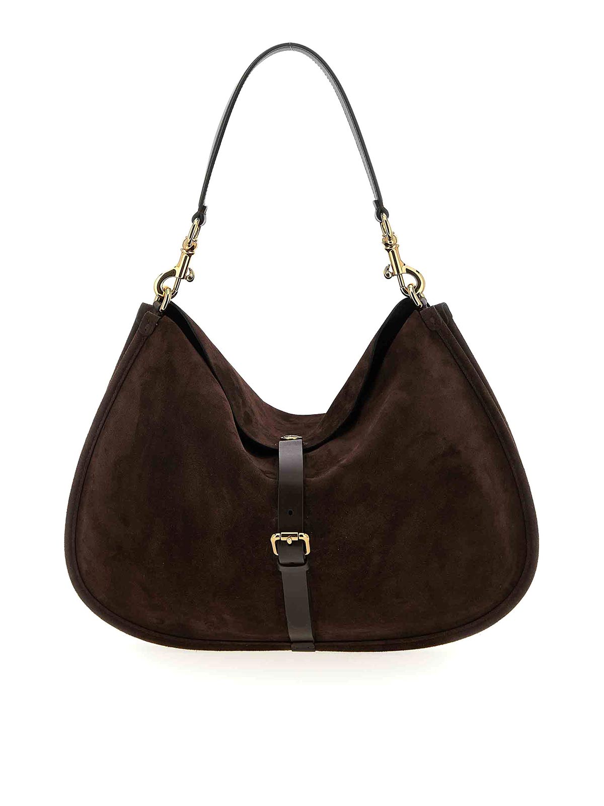 ポニーの大きなスエードショルダーバッグ、滑らかなレザーの裏地、ロゴが刻印されたマグネット式のメタルボタン留め、レザーストラップとメタルバックル、取り外し可能なハンドルが付いています。