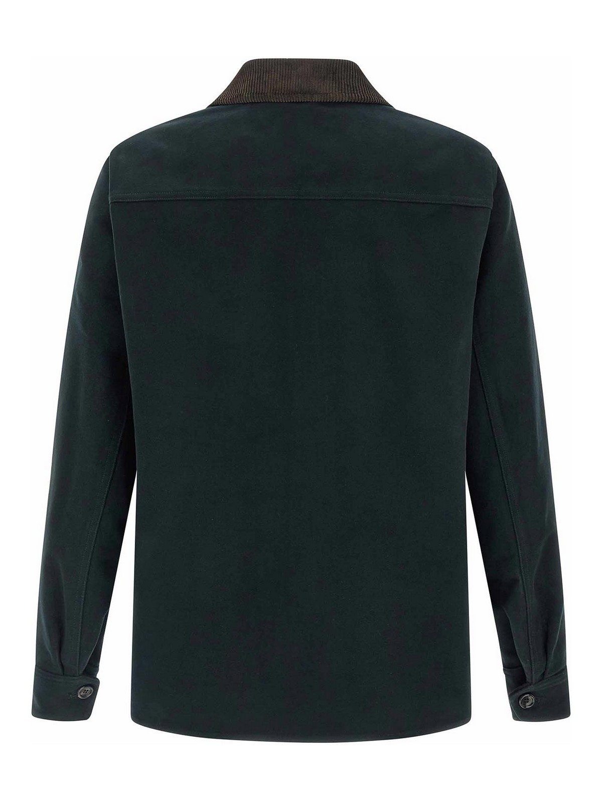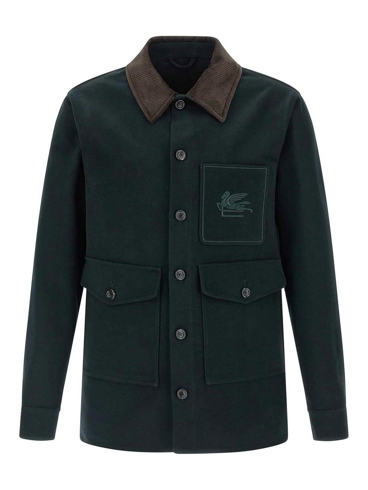ワークウェアモデルのピュアコットンジャケット、トーンオントーンの「ペガソ」刺繍入りポケット、コントラストコーデュロイシャツカラー、フロントボタンクロージャー、ポケット、ロングカフスリーブ、サイドスリット、裏地なし。