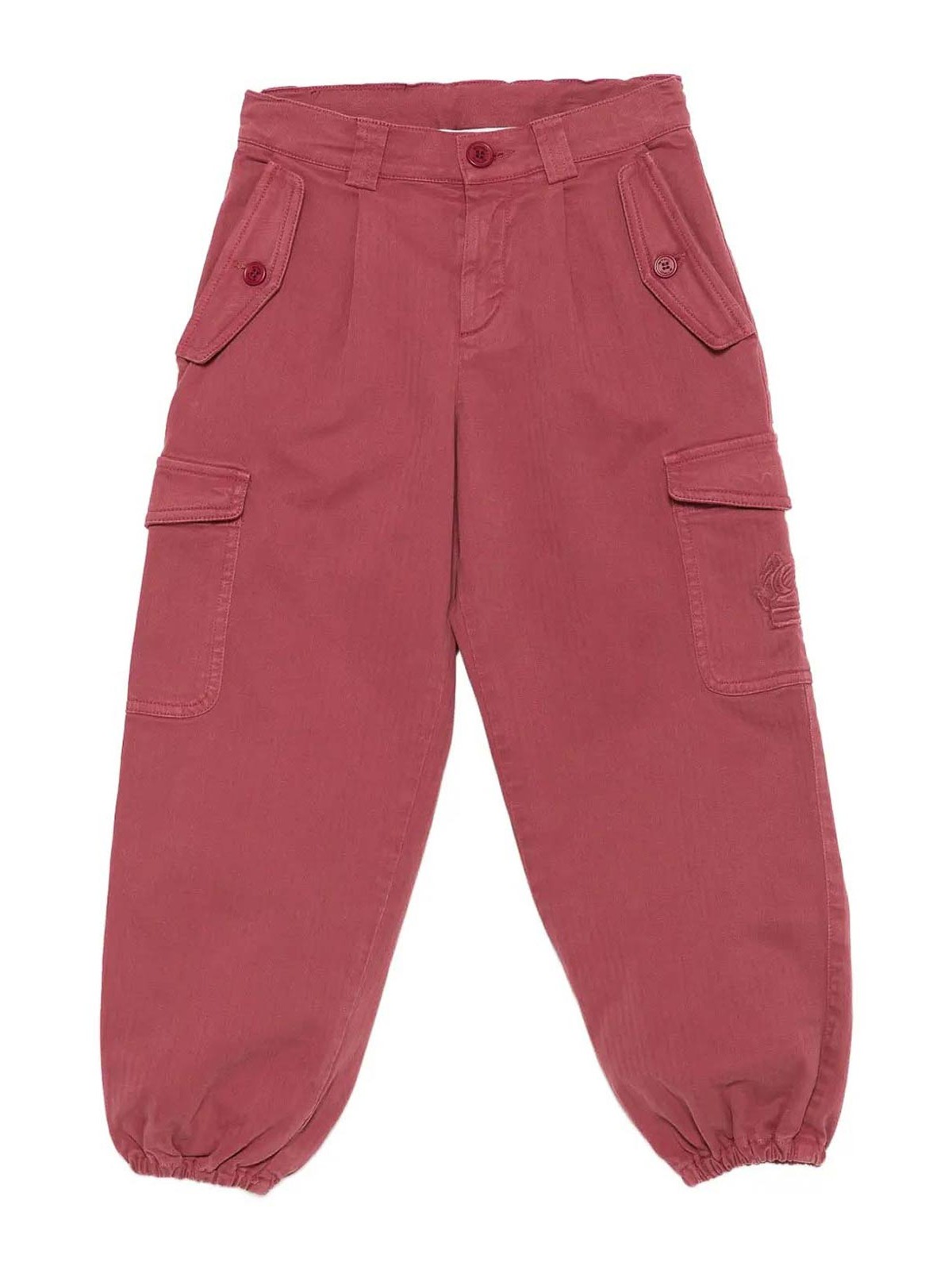 バーガンディのカーゴは、カーゴポケット、伸縮性のあるボタン、刺繍入りプリーツが特徴です。