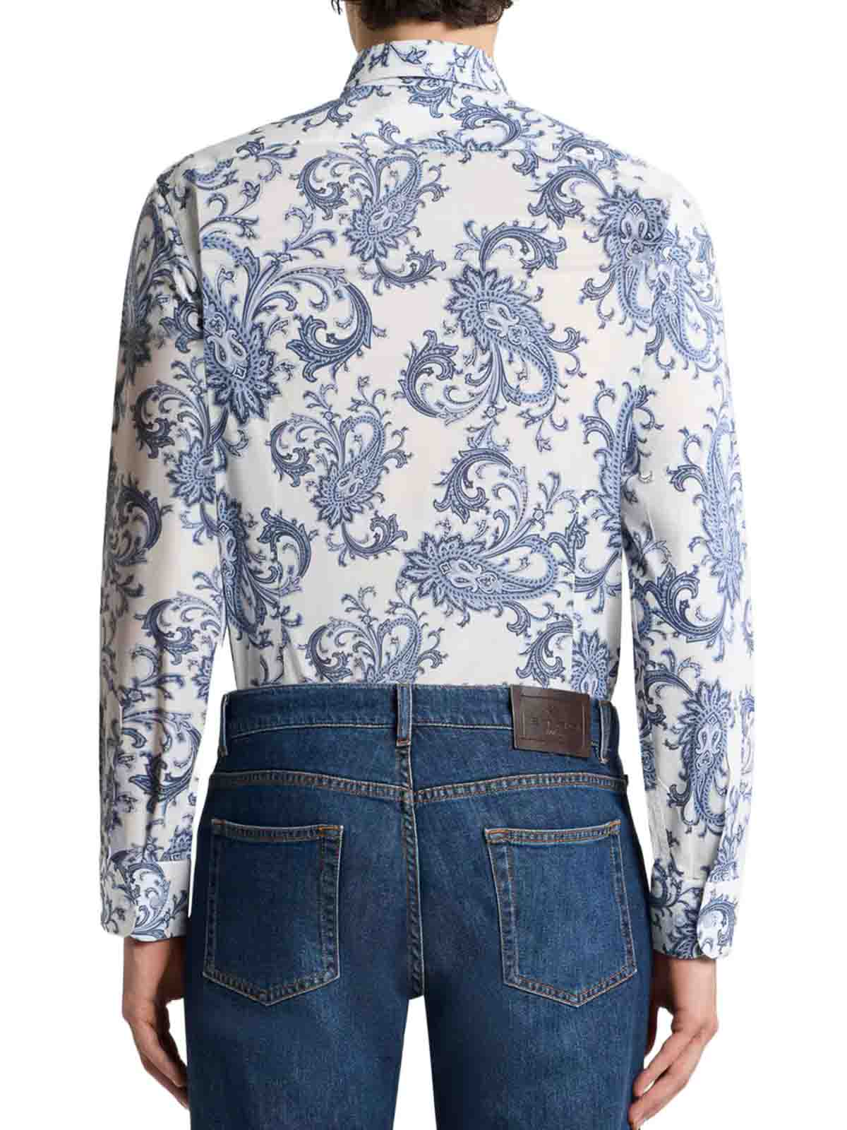 ストレッチコットンシャツ、全面に花柄をあしらったペイズリー柄、ポインテッドカラー、ロゴボタン留め、ダブルボタンカフス、レギュラーフィット、モデルの身長は186cm、サイズ39を着用しています。色:ホワイト/ブルー