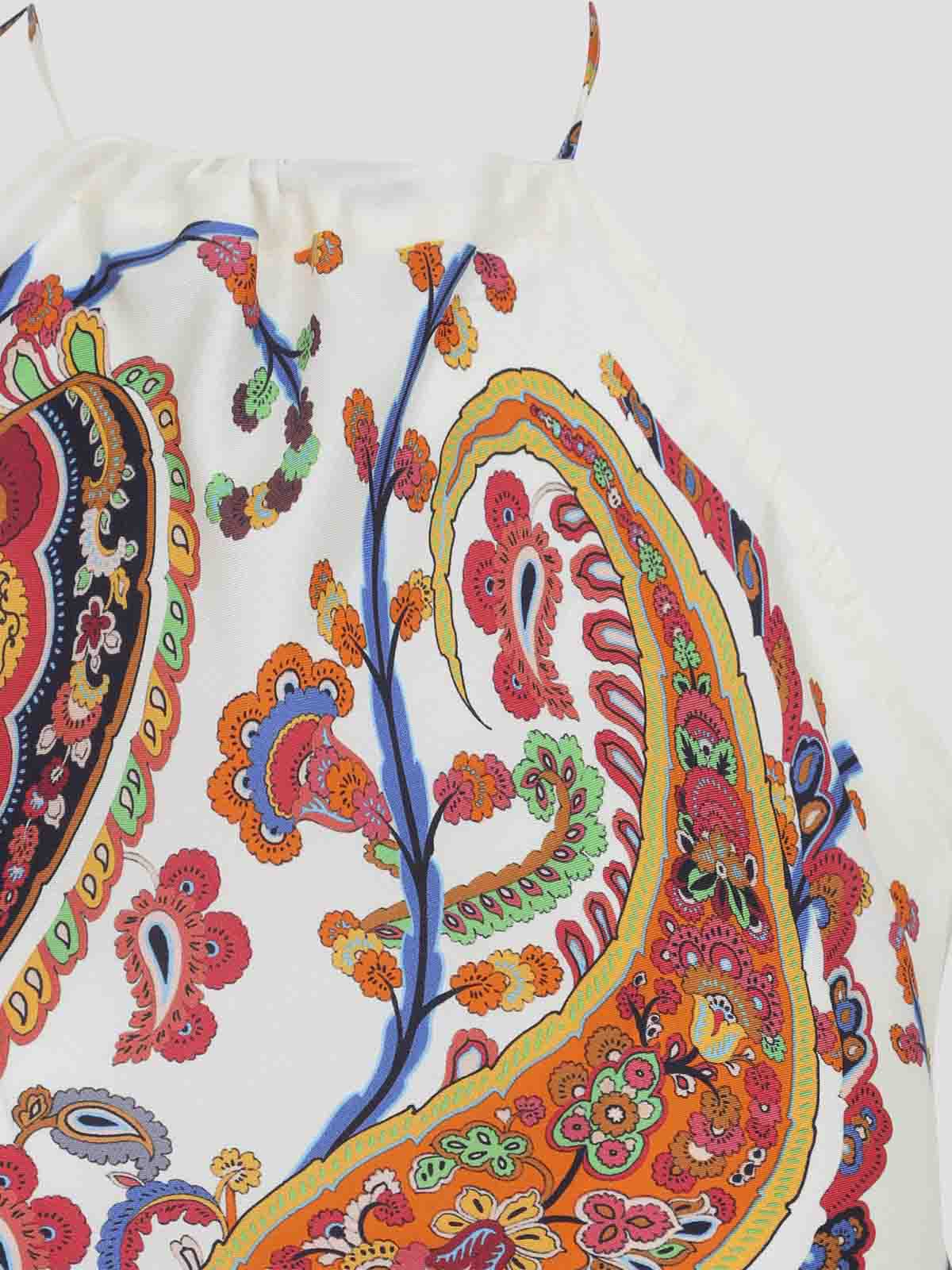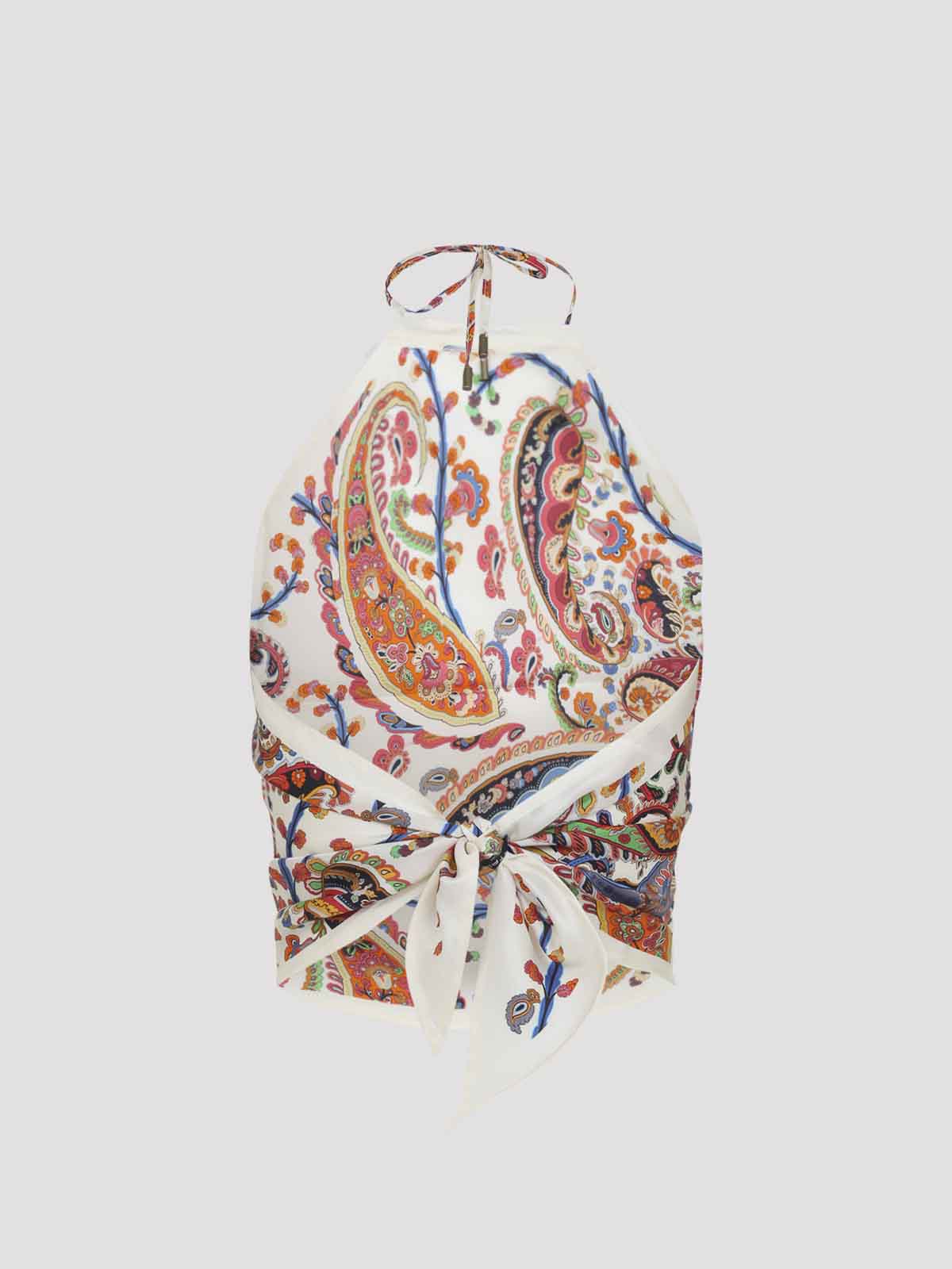 エトロタイアップバンダナホワイトシルクトップ。全体にマルチカラーのペイズリー柄をあしらったホワイトシルク製のホルターネックトップ。オープンバックとバックの2つのセルフタイ留めが特徴です。