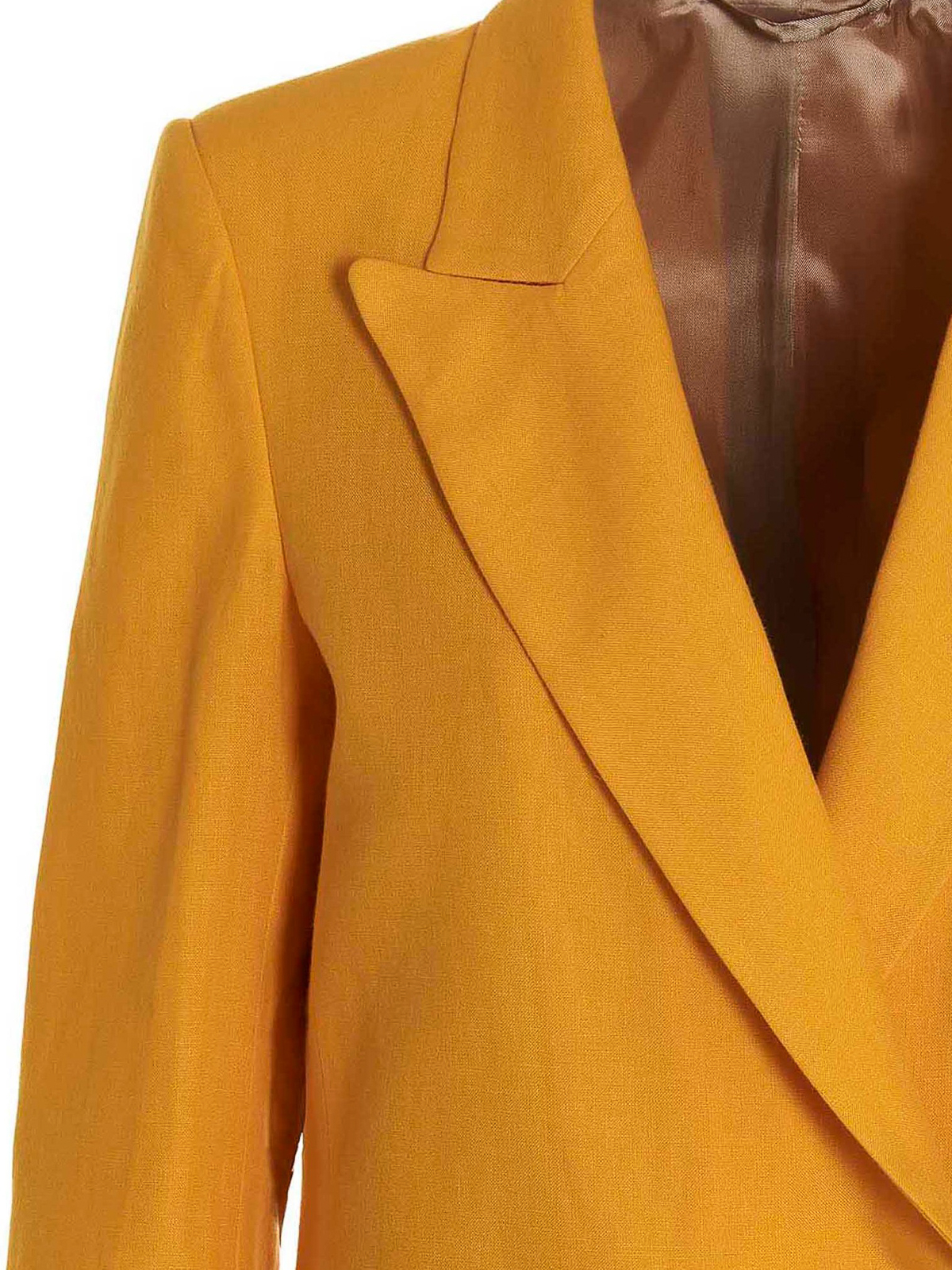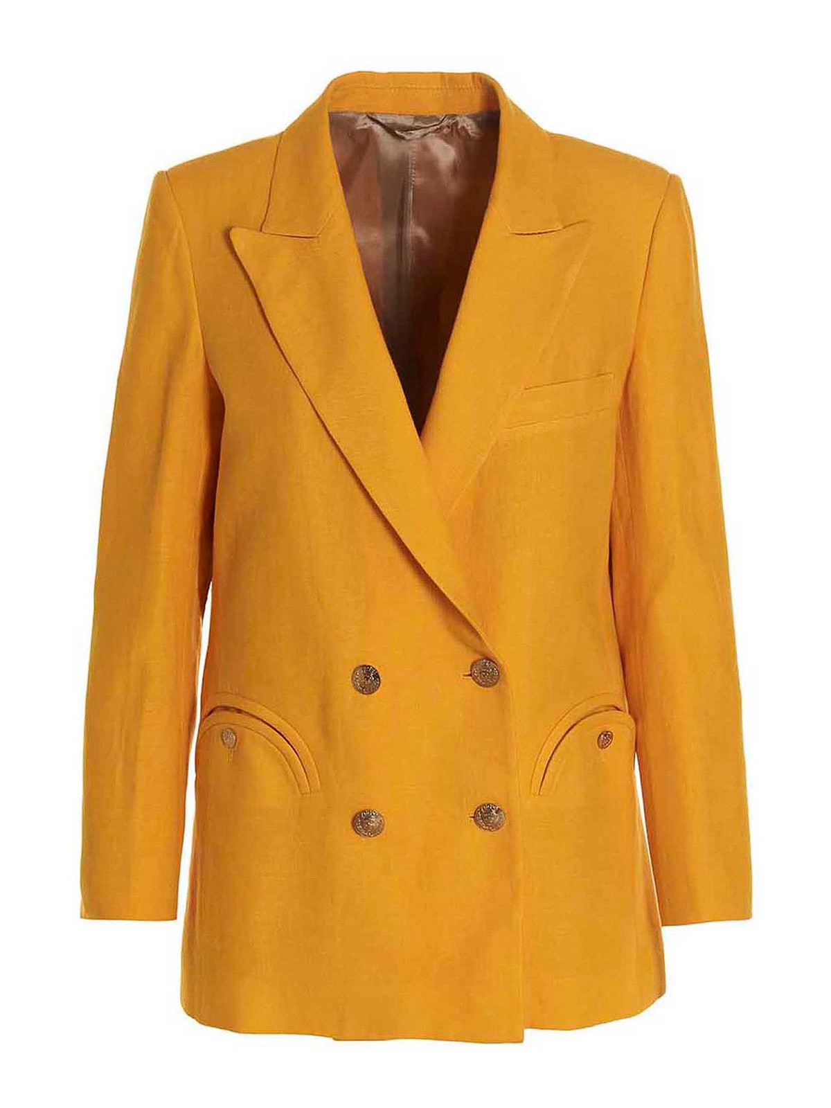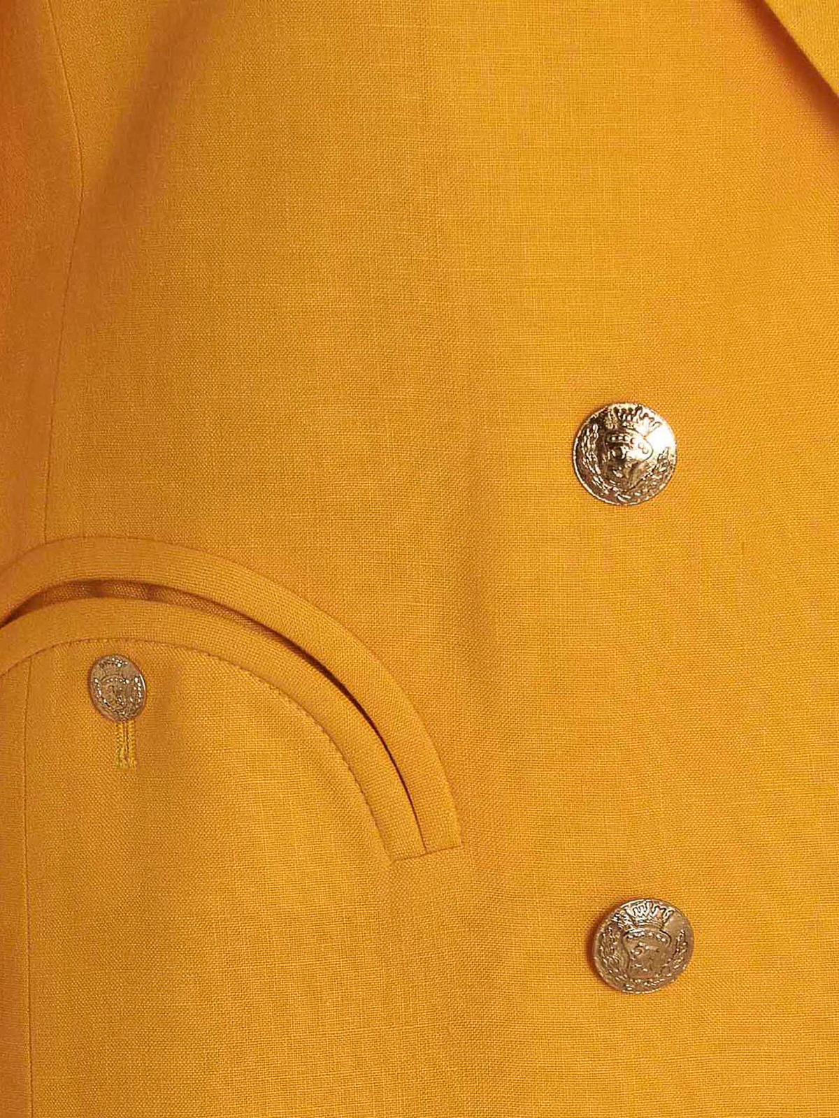 ボタン留め、ポケット、長袖、後ろに通気口が付いたダブルブレストのリネンブレザー。