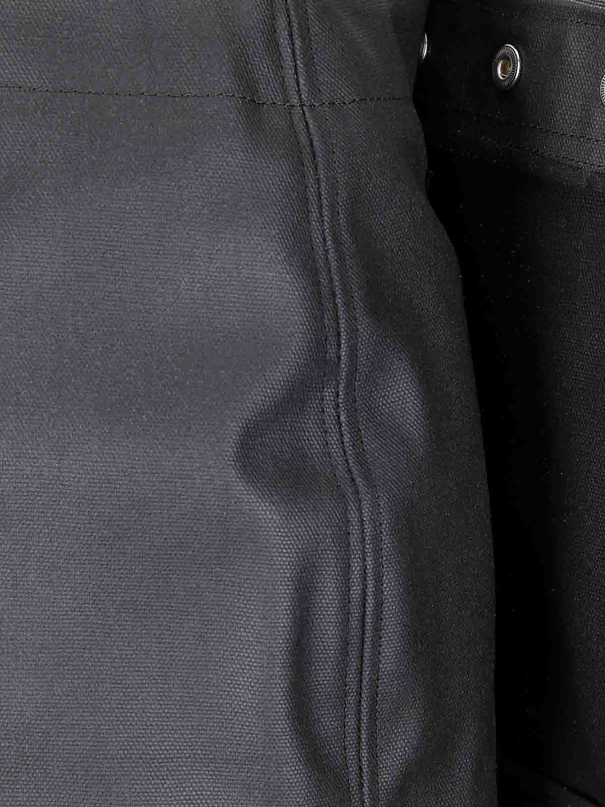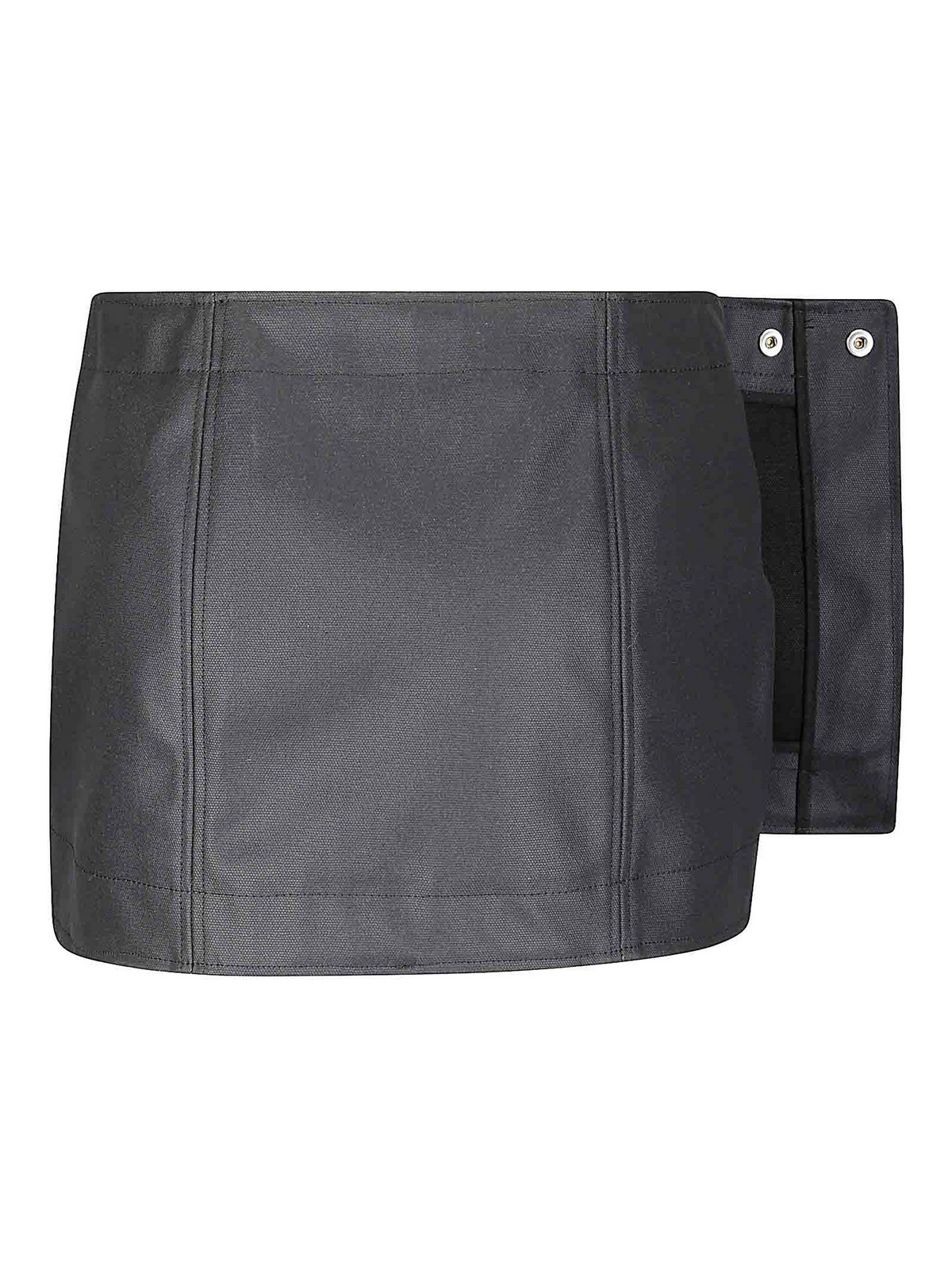 ワックス加工を施したショートスカート、スナップボタンで調節可能なクロージャー、リジッドでアシンメトリーなデザイン。