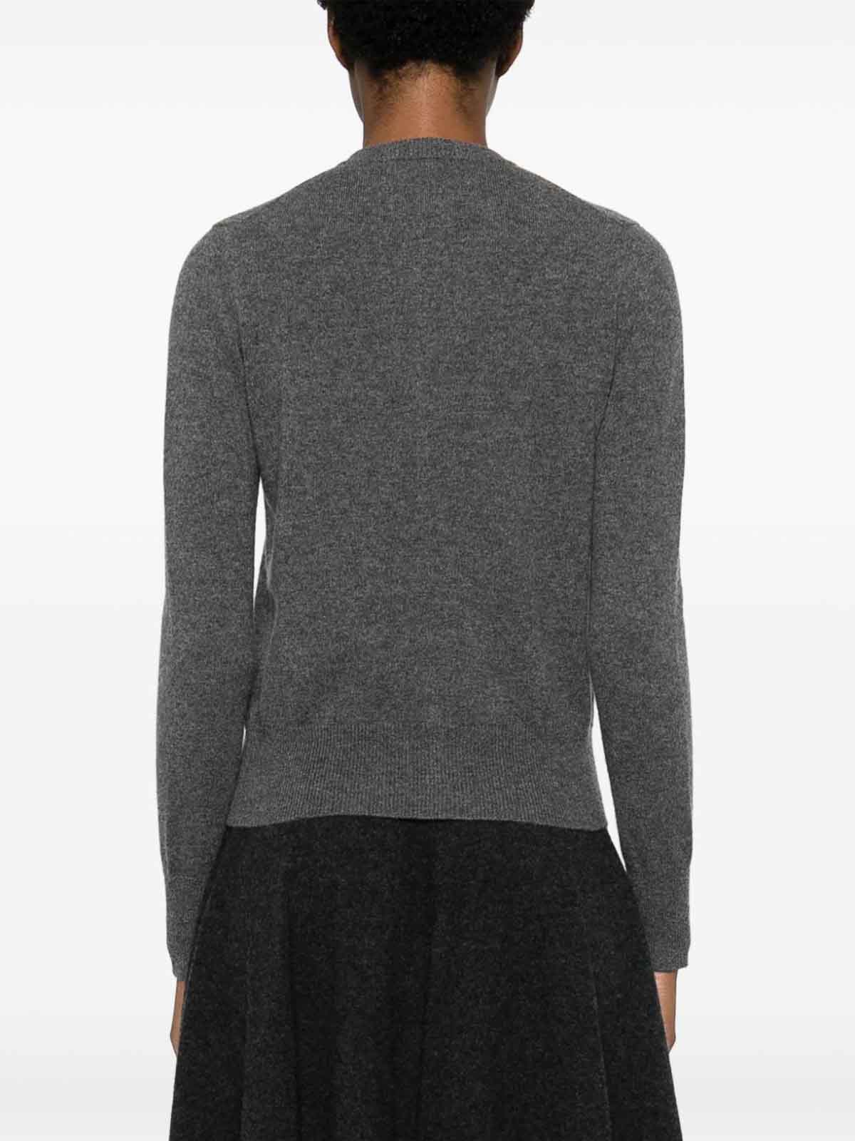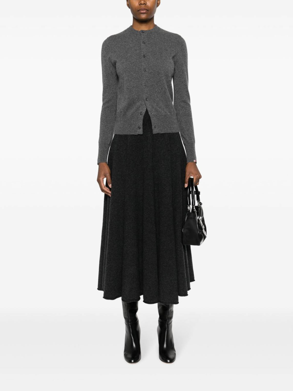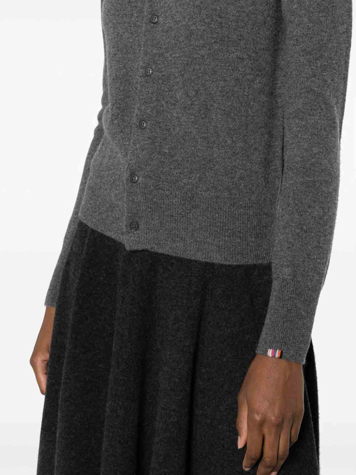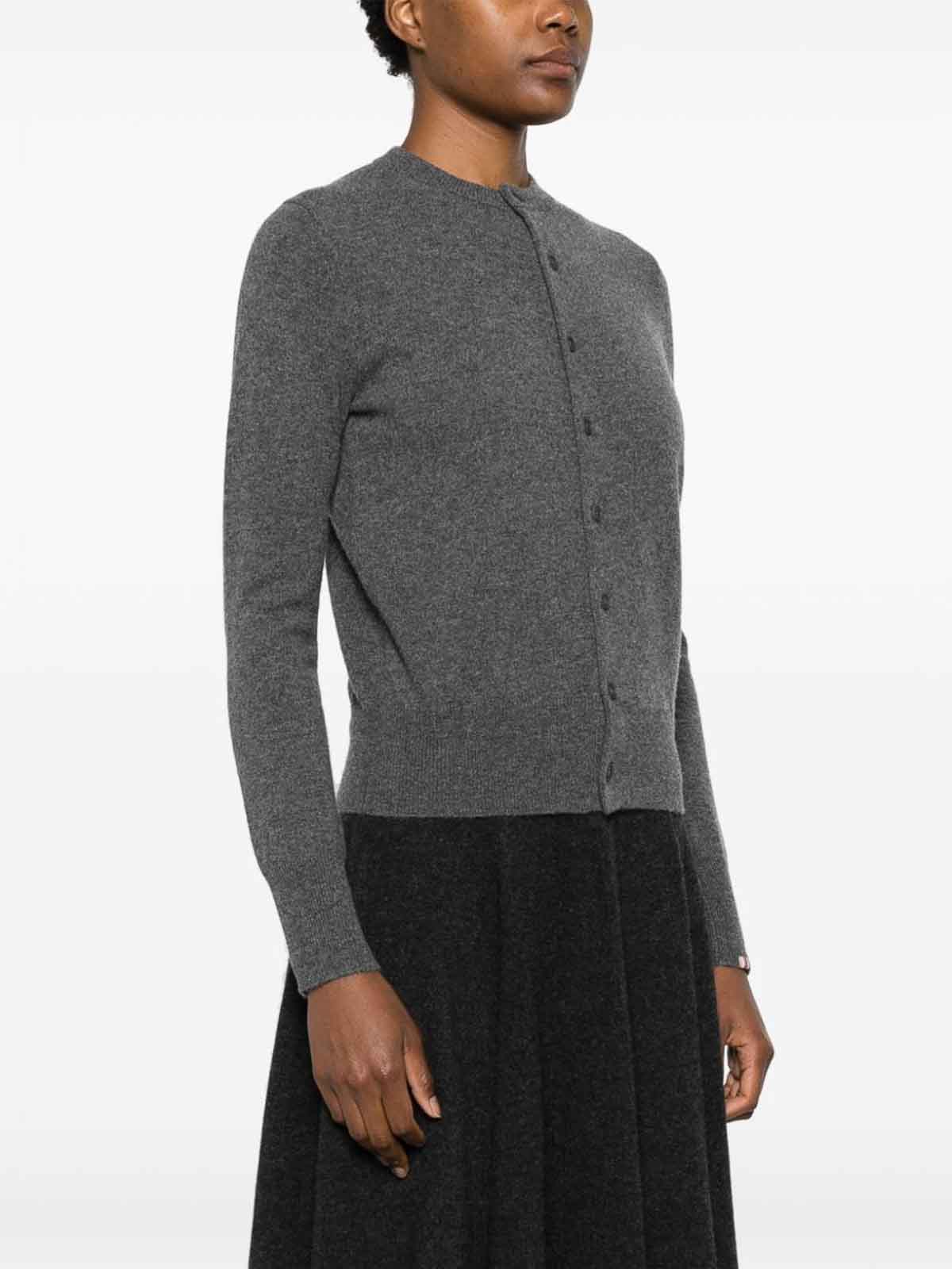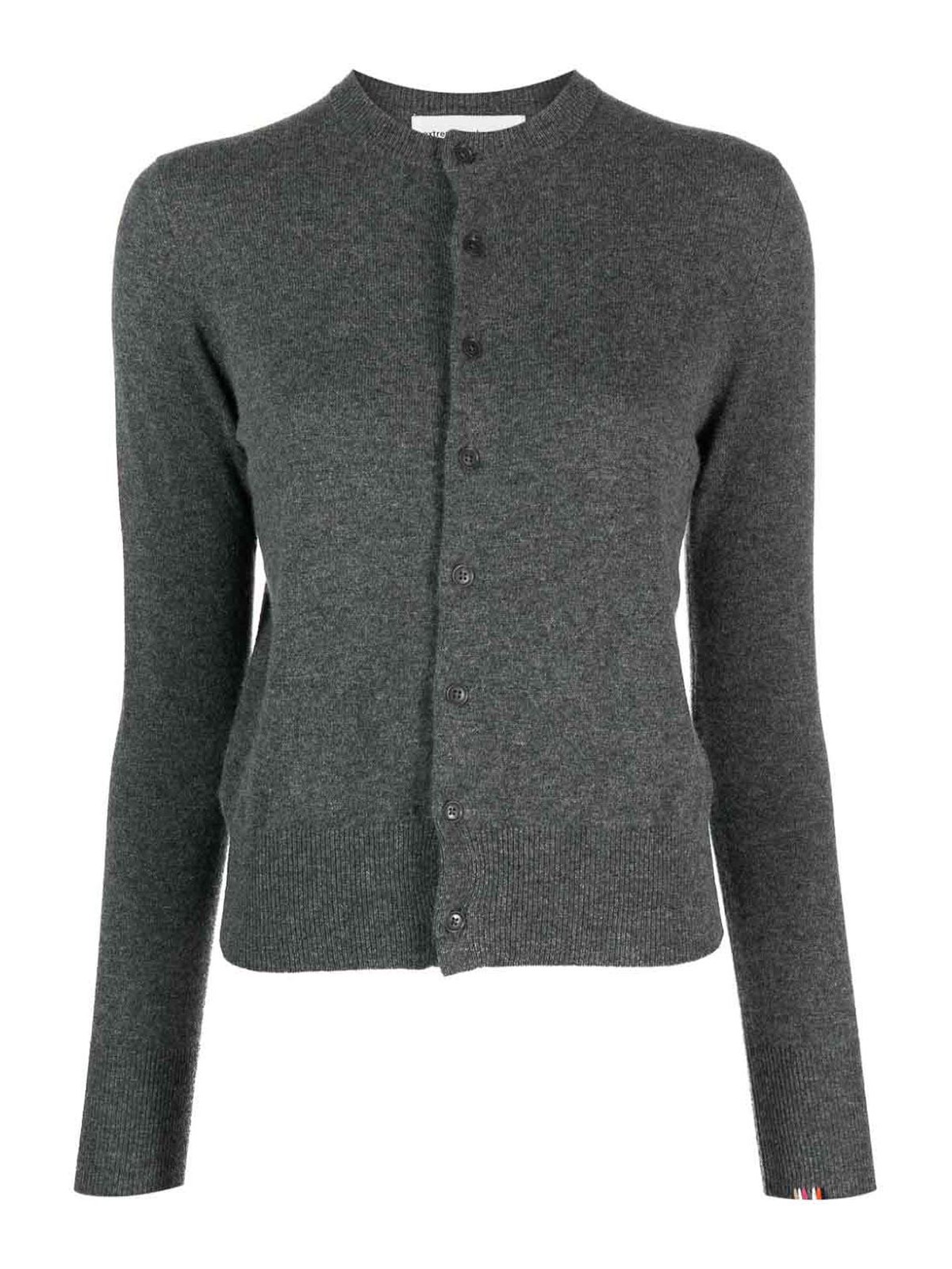 グレーカシミアファインニットフロントボタン留めラウンドネック長袖リブ付きトリムストレートヘム