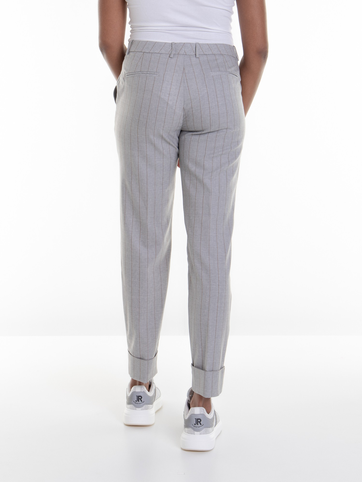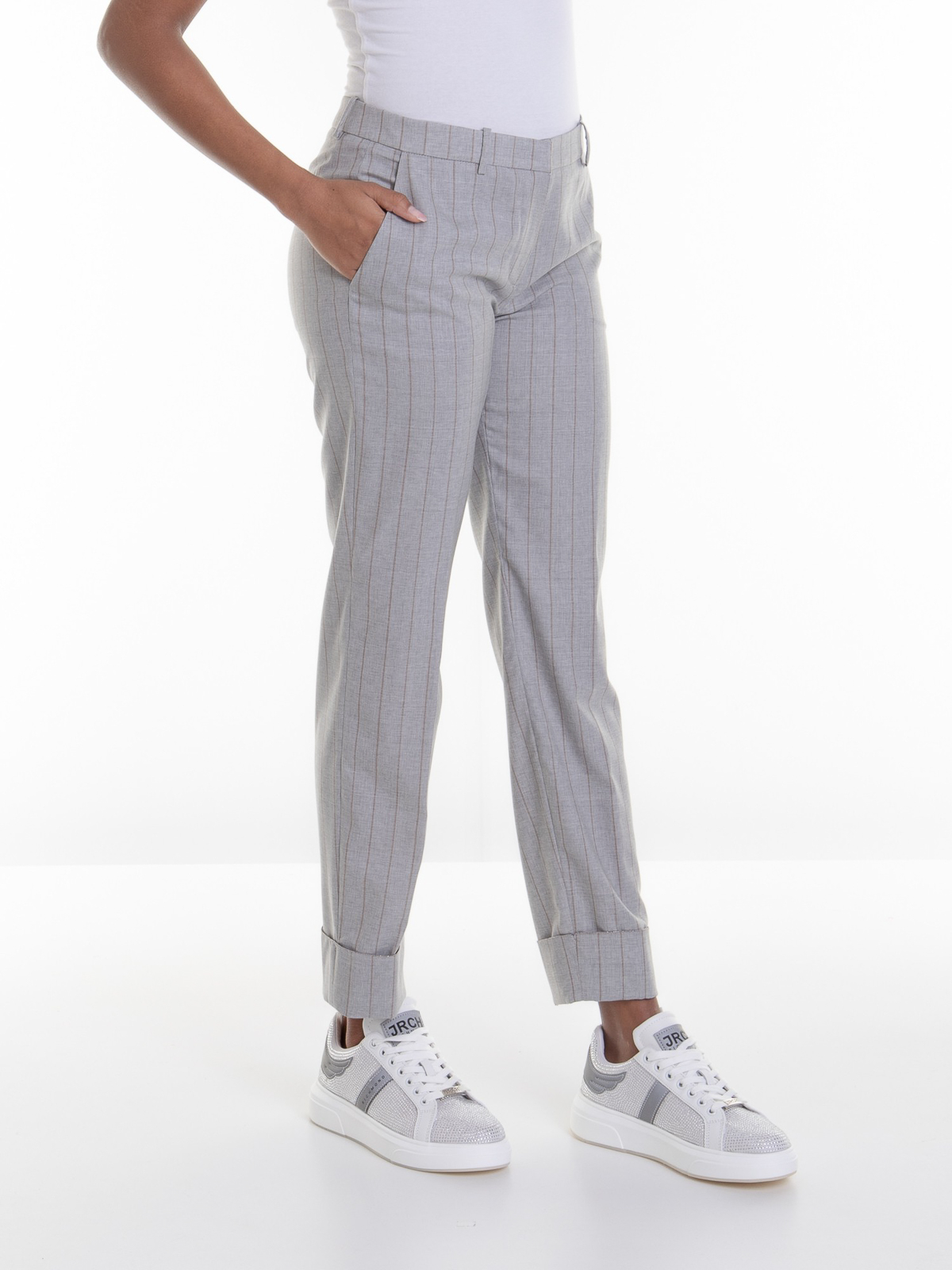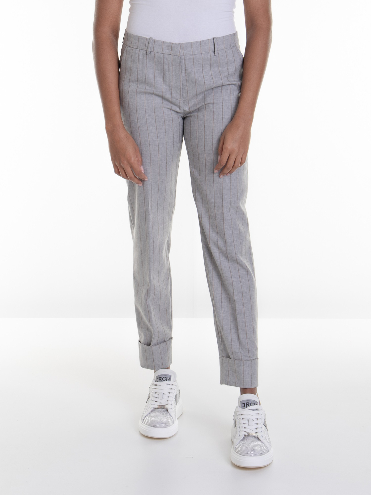 袖口付きストレートレッグウールパンツ、レギュラーフィット、ファスナーとボタン留め、フロントポケット2つ、バックポケット2つ、ストライプ柄。