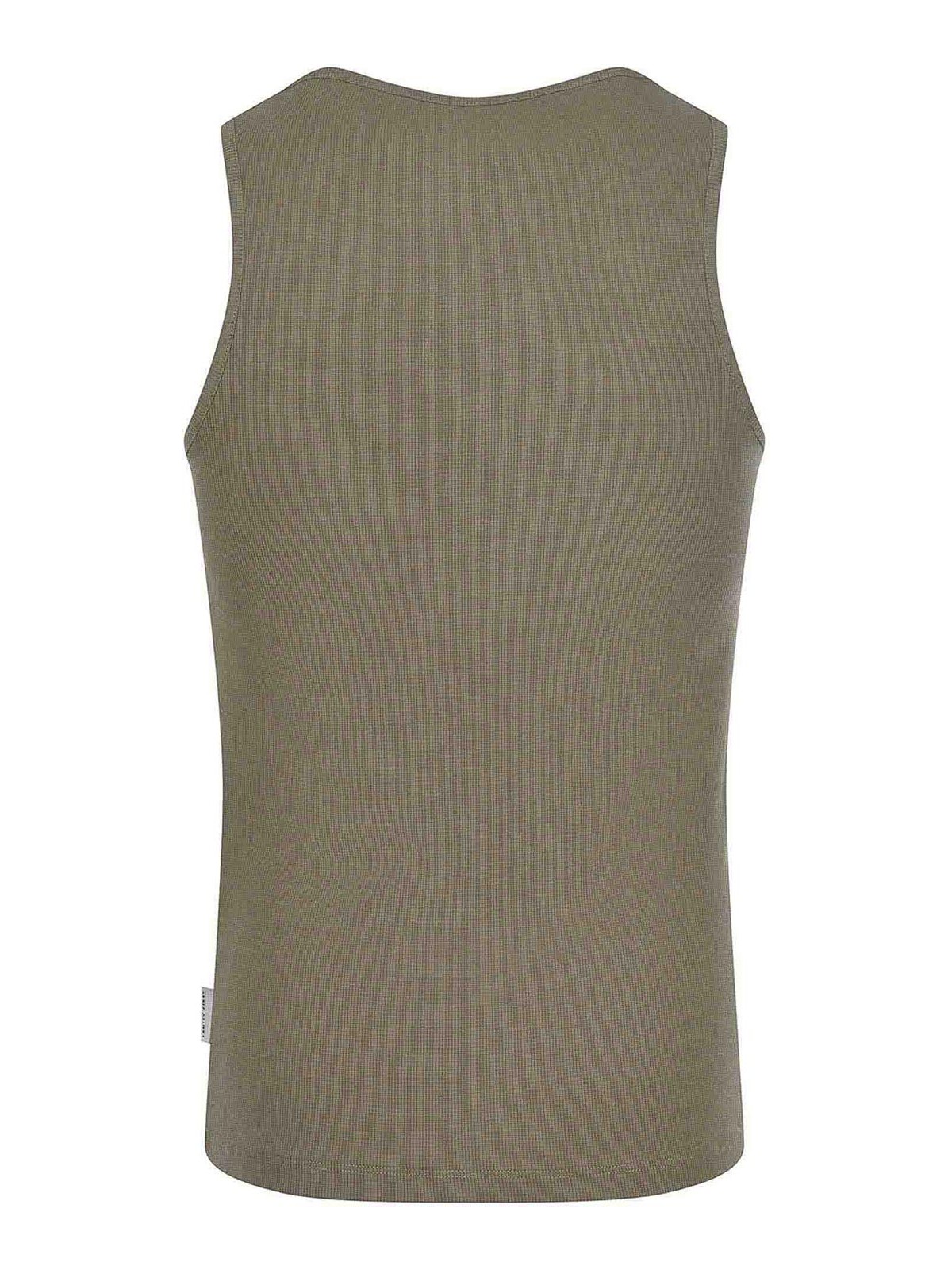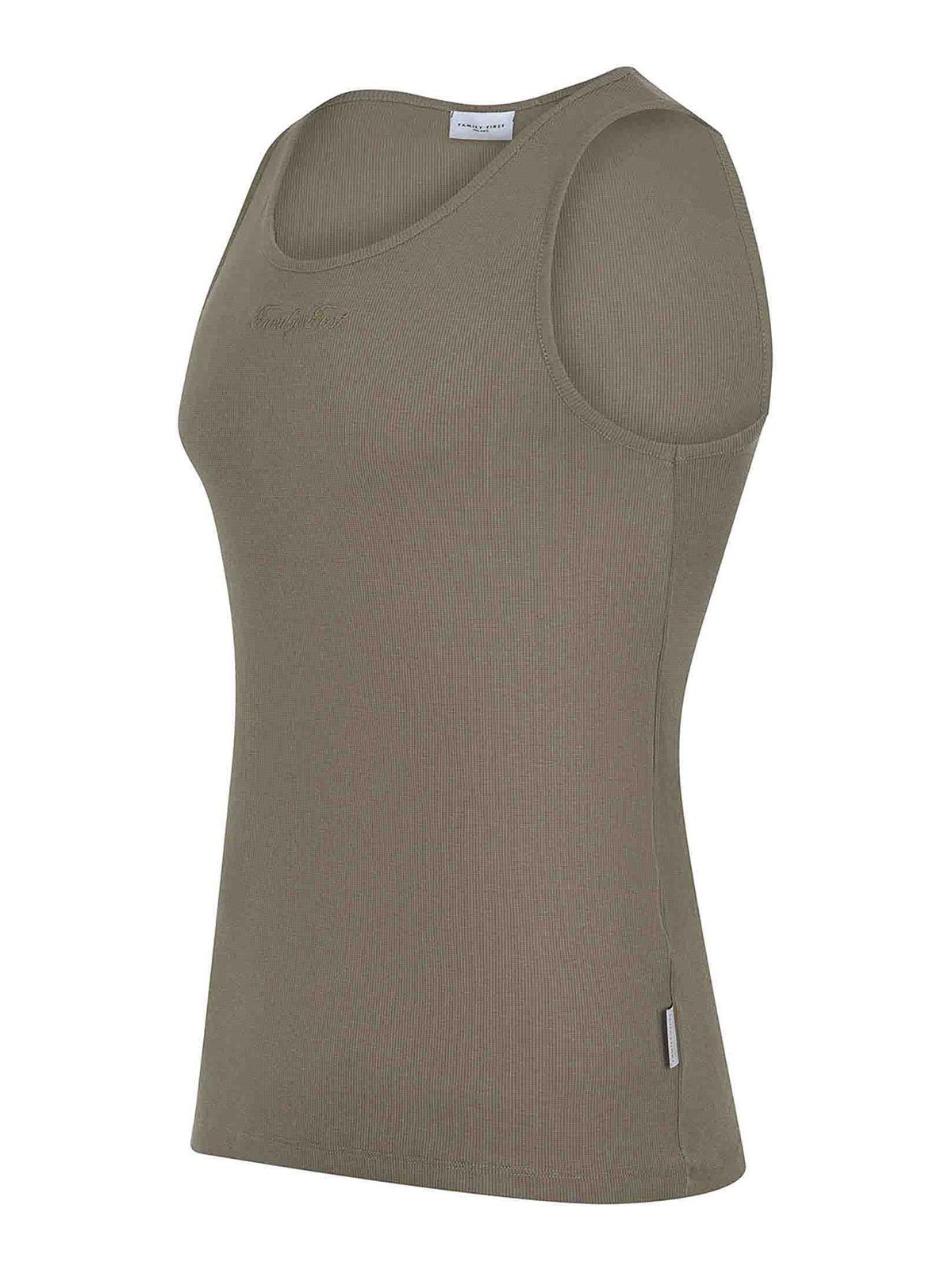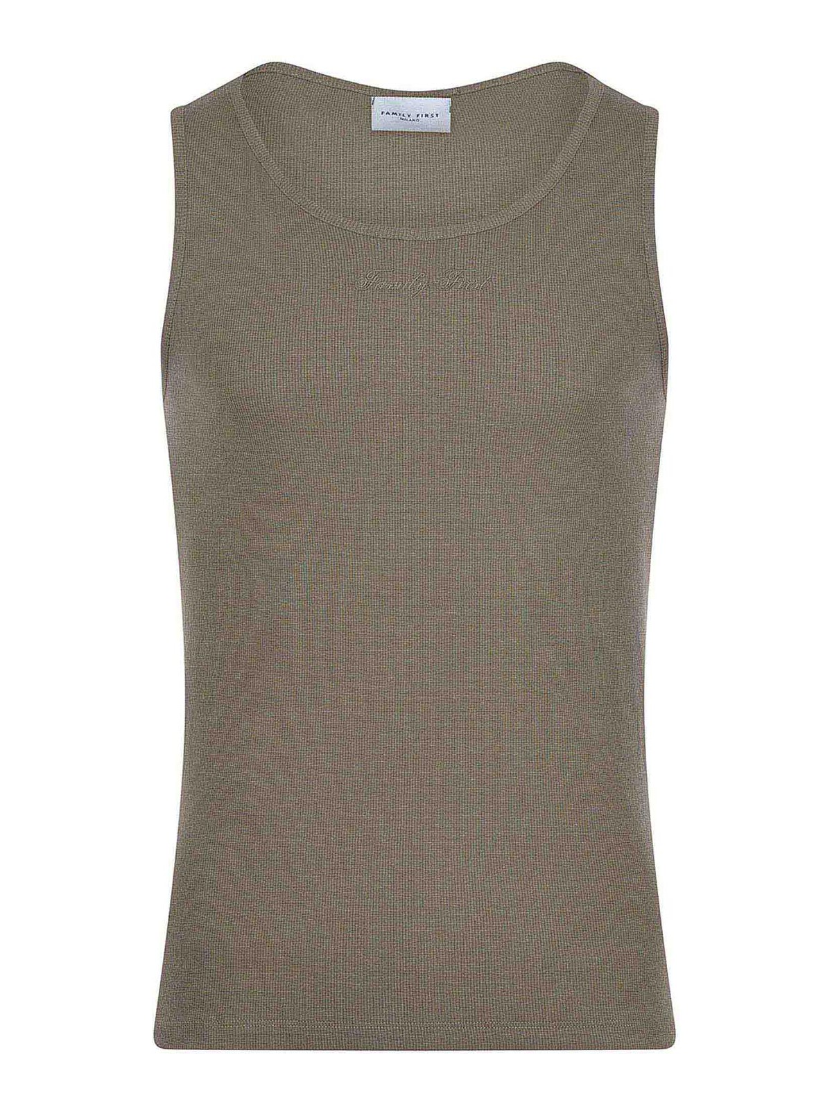 ライトグリーンのリブコットン製の家族初のタンクトップ。胸元にはトーン・オン・トーンの刺繍ロゴレタリング。100% コットン、イタリア製