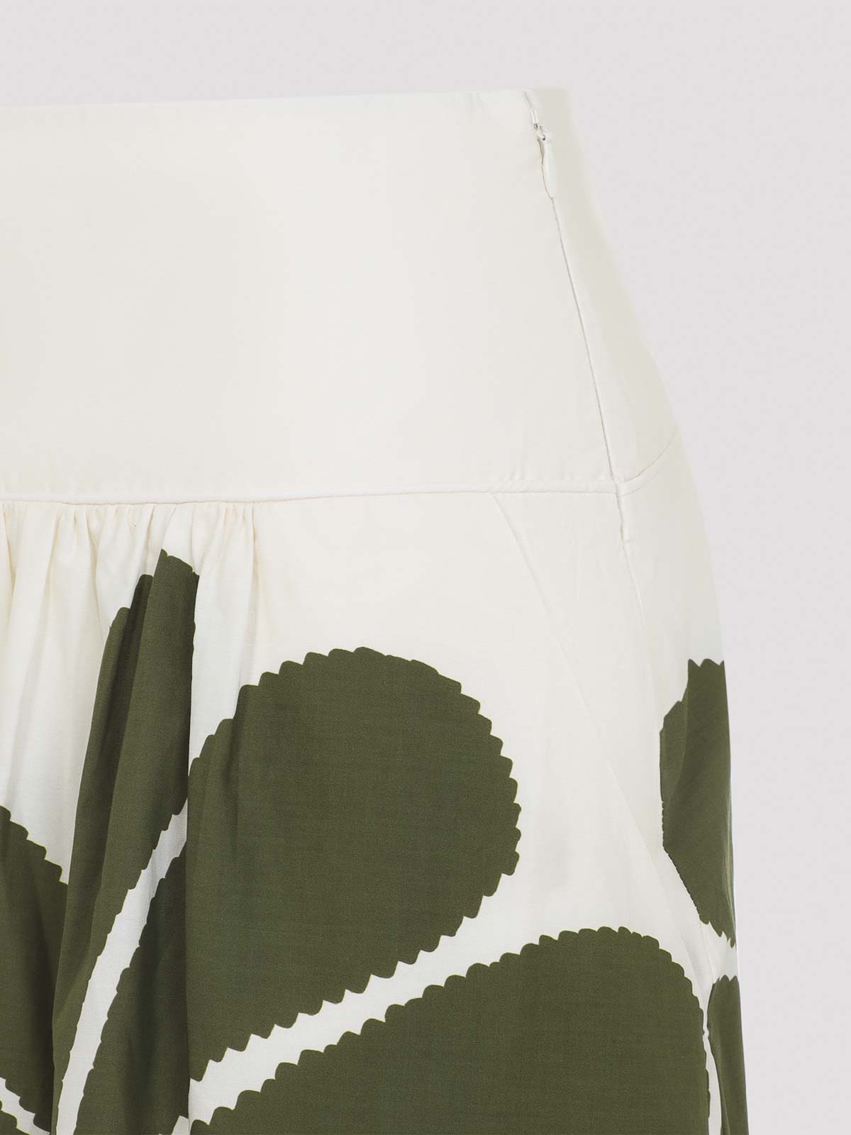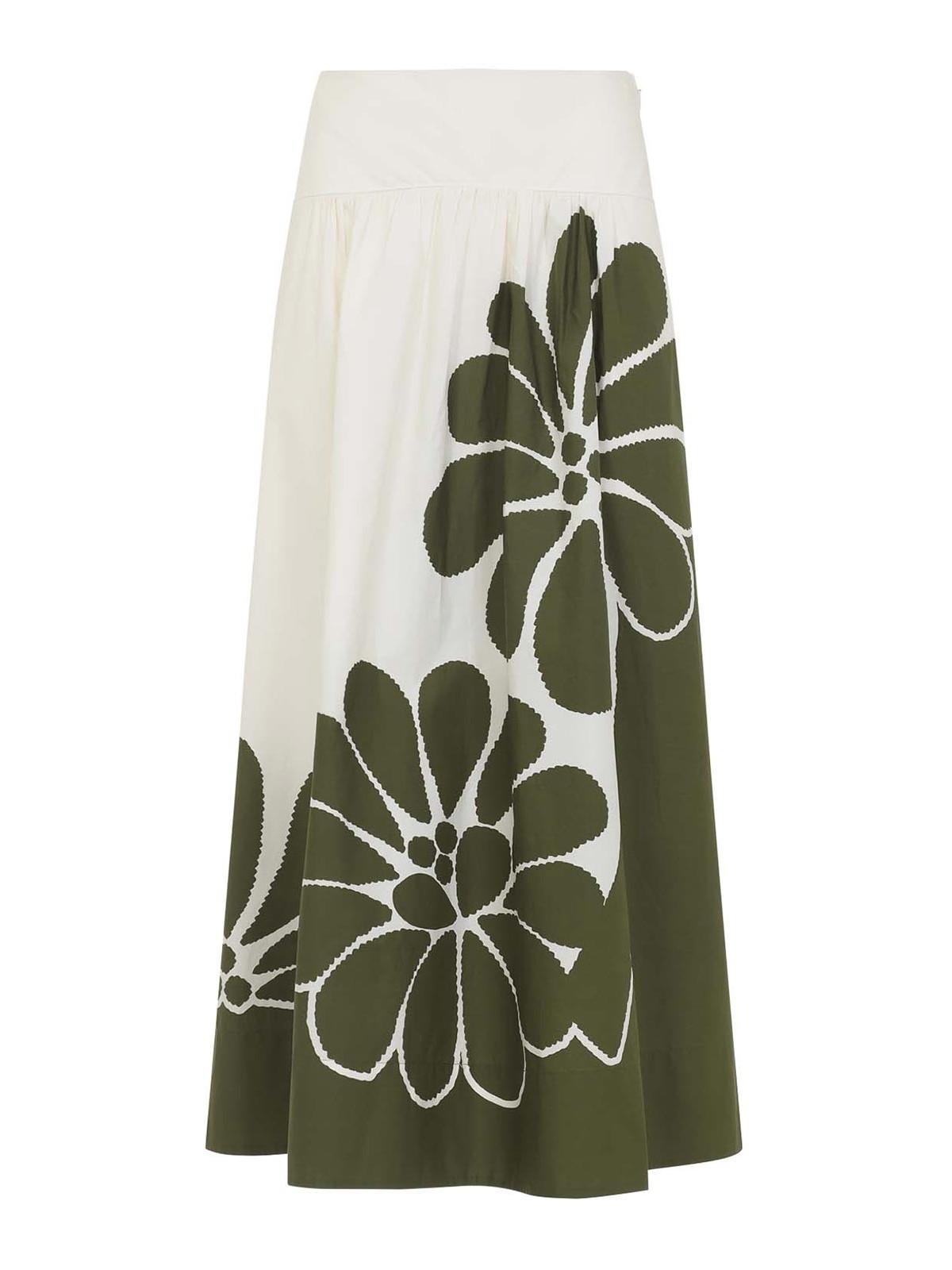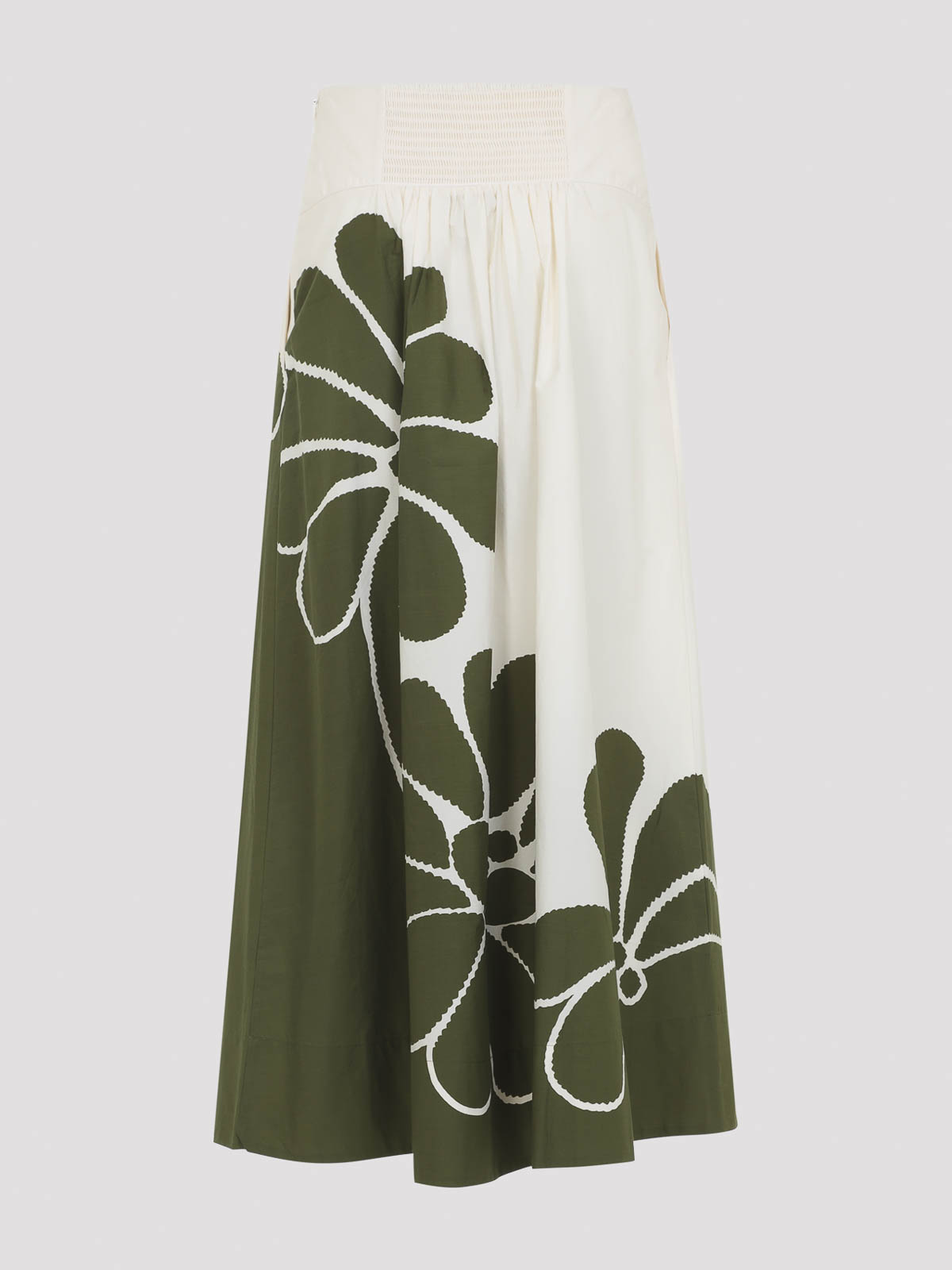 Farm bio palermo ホワイトとグリーンのコットンミディスカート。グリーンの花柄プリントをあしらったホワイトコットン製のフレアミディスカート。背面にスモック加工を施した大胆なウエストバンドとサイドの隠しファスナーが特徴です。