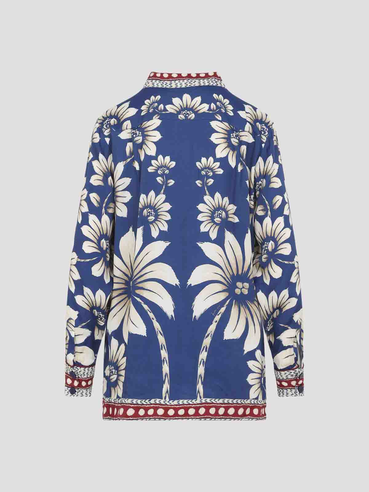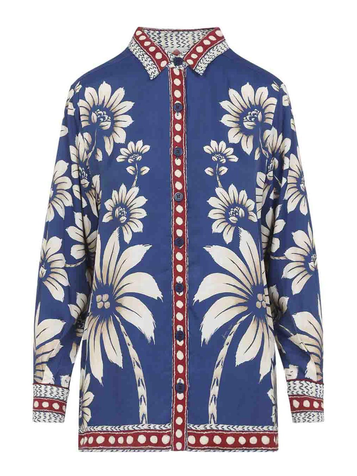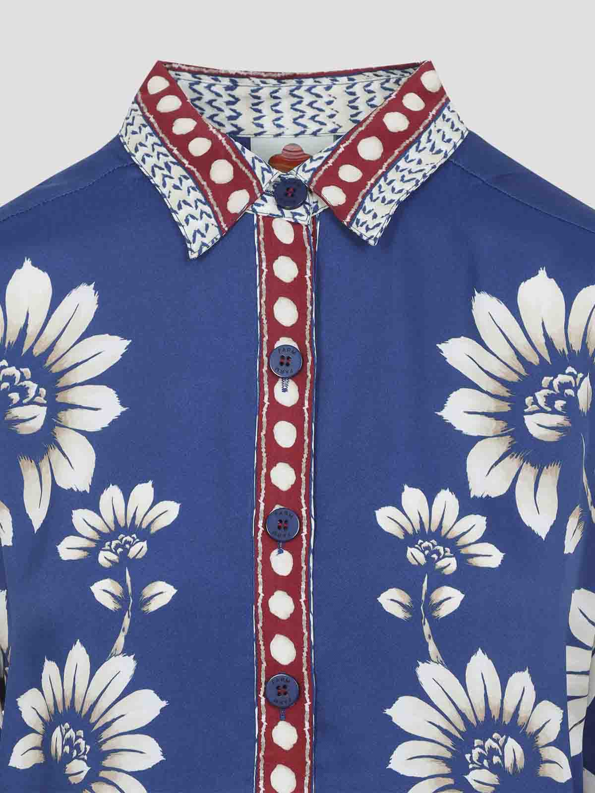 ファームリオルナブルービスコースシャツ。ブルービスコース製で、赤と白の幾何学的なディテールが対照的な全面に花柄プリントが施され、先のとがった襟、フロントボタン留め、ボタン付きカフス付きの長袖、バックヨーク、ストレートヘムが特徴です。