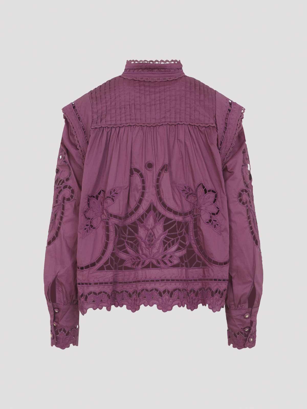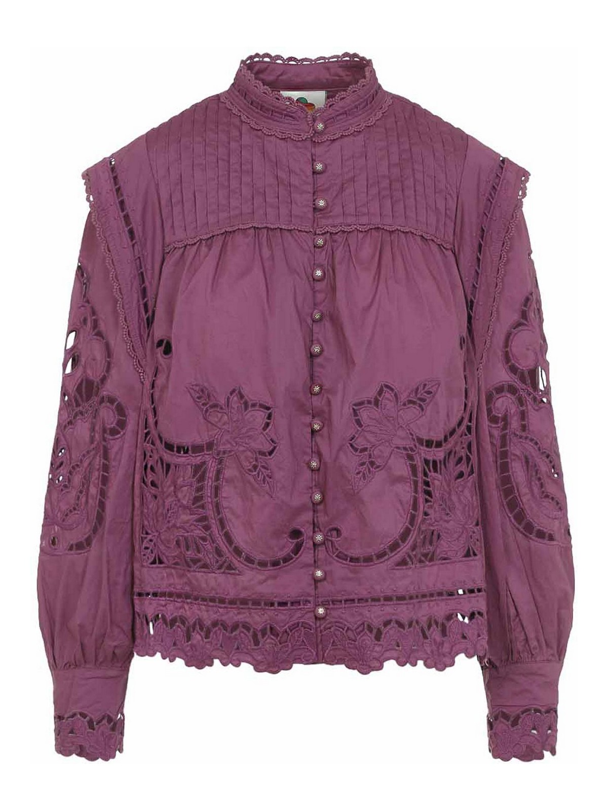 ファームリオリシュリューピンクのコットンブラウス。ダークピンクのコットン製で、全体にリシュリューの刺繍が施され、ラウンドカラー、フロントプリーツインサート、ボタン留め、バルーンスリーブ、スカラップヘムが特徴です。