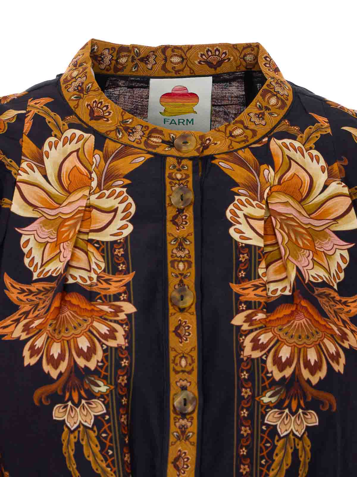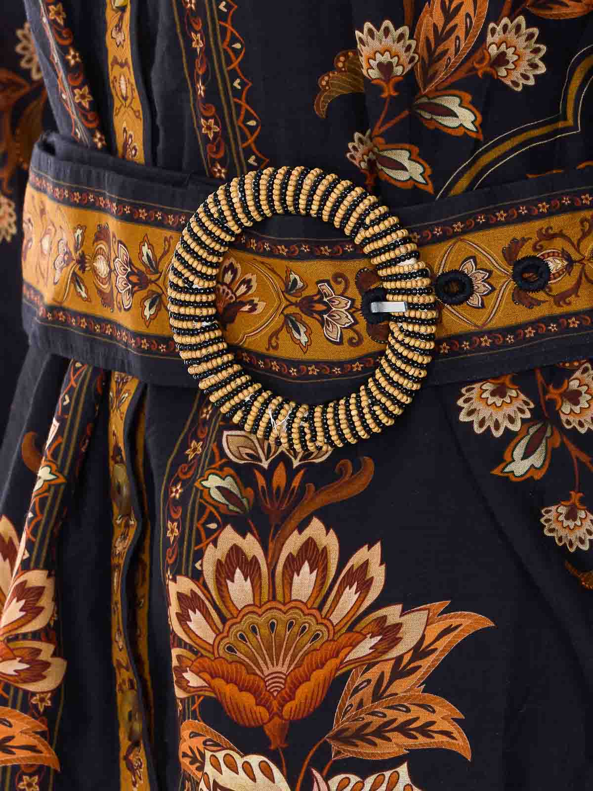 ファームリオマジェスティックガーデンドレス、ボタン留め、長袖、ペイズリープリント、クルーネック、ウエストベルト