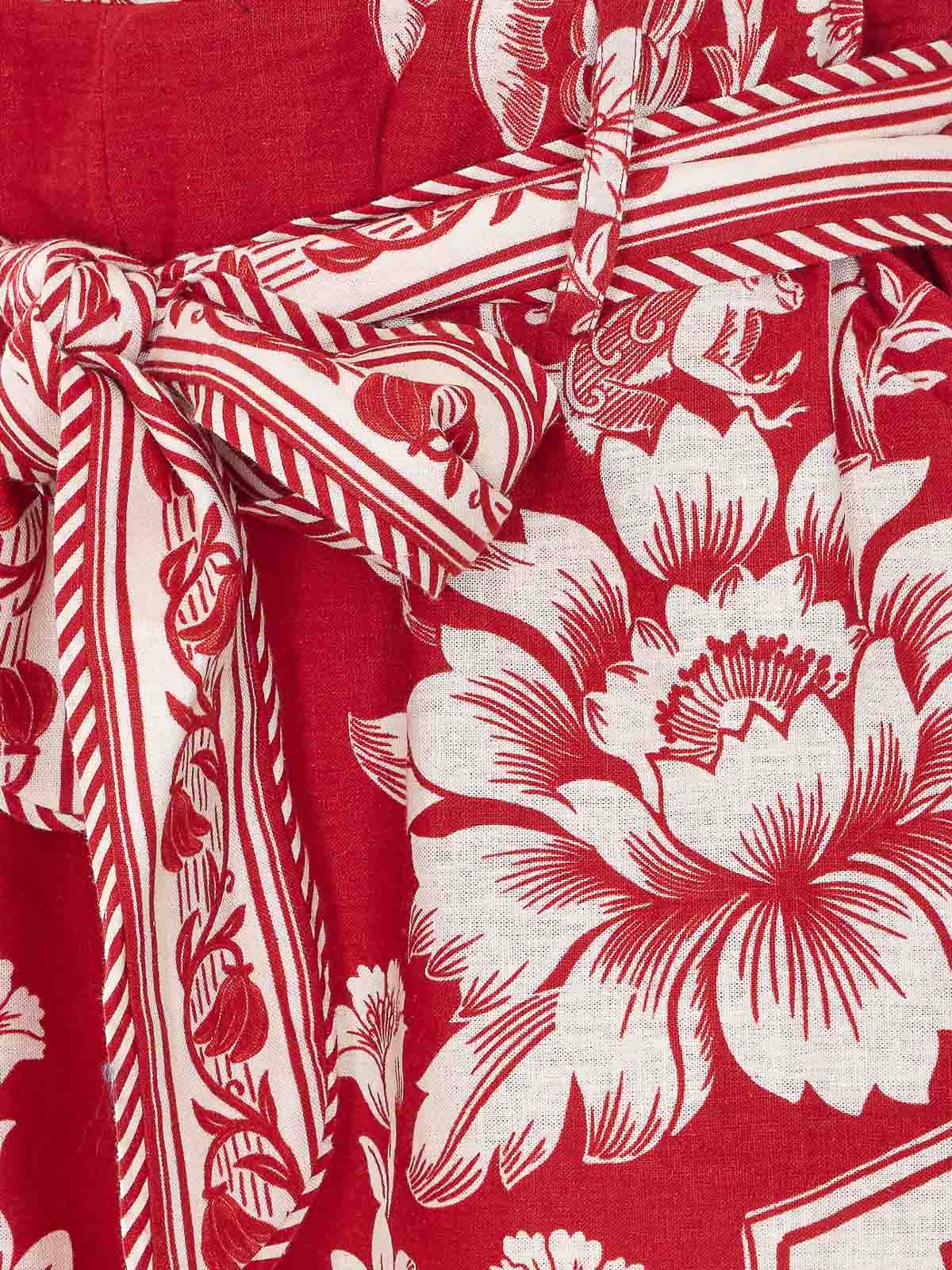 ファームリオレッドグアナカステレッドギャザリングドレス、横ファスナー開閉、ウエストにベルト、花柄とペイズリー柄