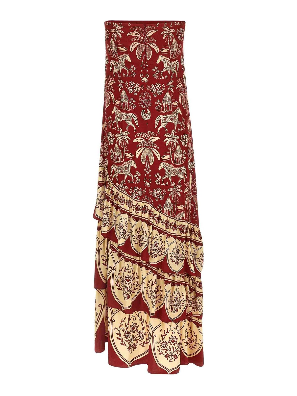 ビスコースエコヴェロ柄のレンチングを使用したロングドレス、オフショルダーのバンドーモデル、取り外し可能なショルダーストラップ、フリル付きノースリーブのストレートスカート、サイドジッパー、アシンメトリーヘム。