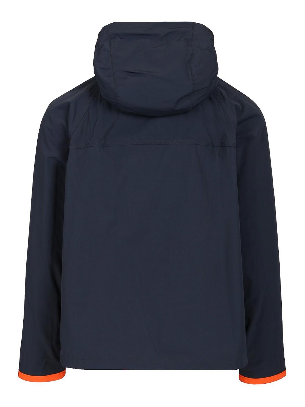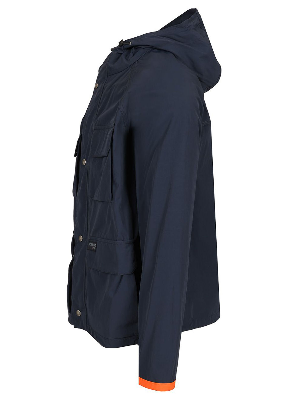 水に濡れたフード付きウィンドブレーカー。ラグランスリーブ、ジッパー、スナップボタンで日を追い払うことができます。フラップ付きパッチポケット4つ、コントラストの効いた袖口。フェイアーカイブロゴラベル