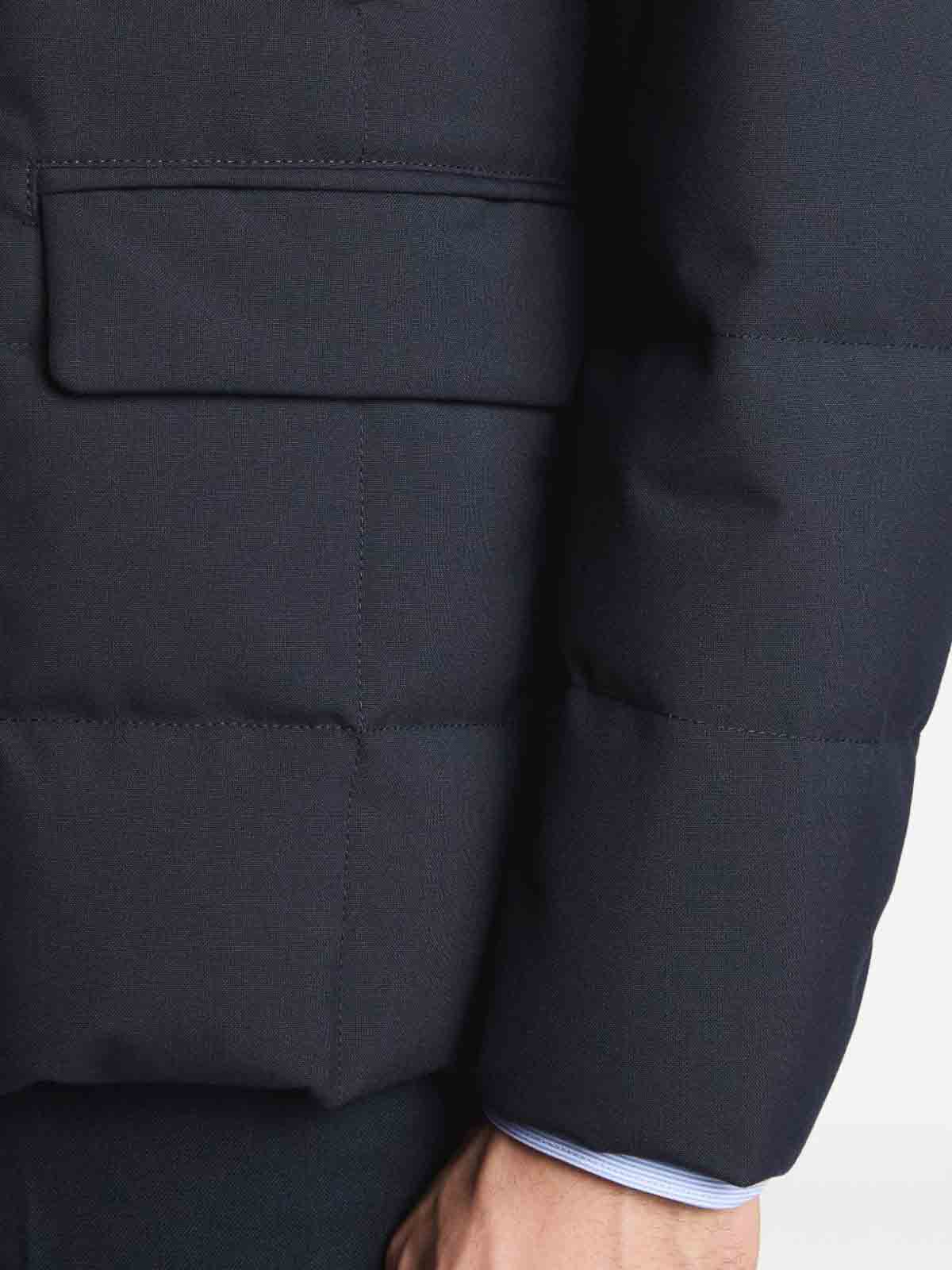 ネイビーブルーのスタンドアップカラーポケットボタンキルトデザイン