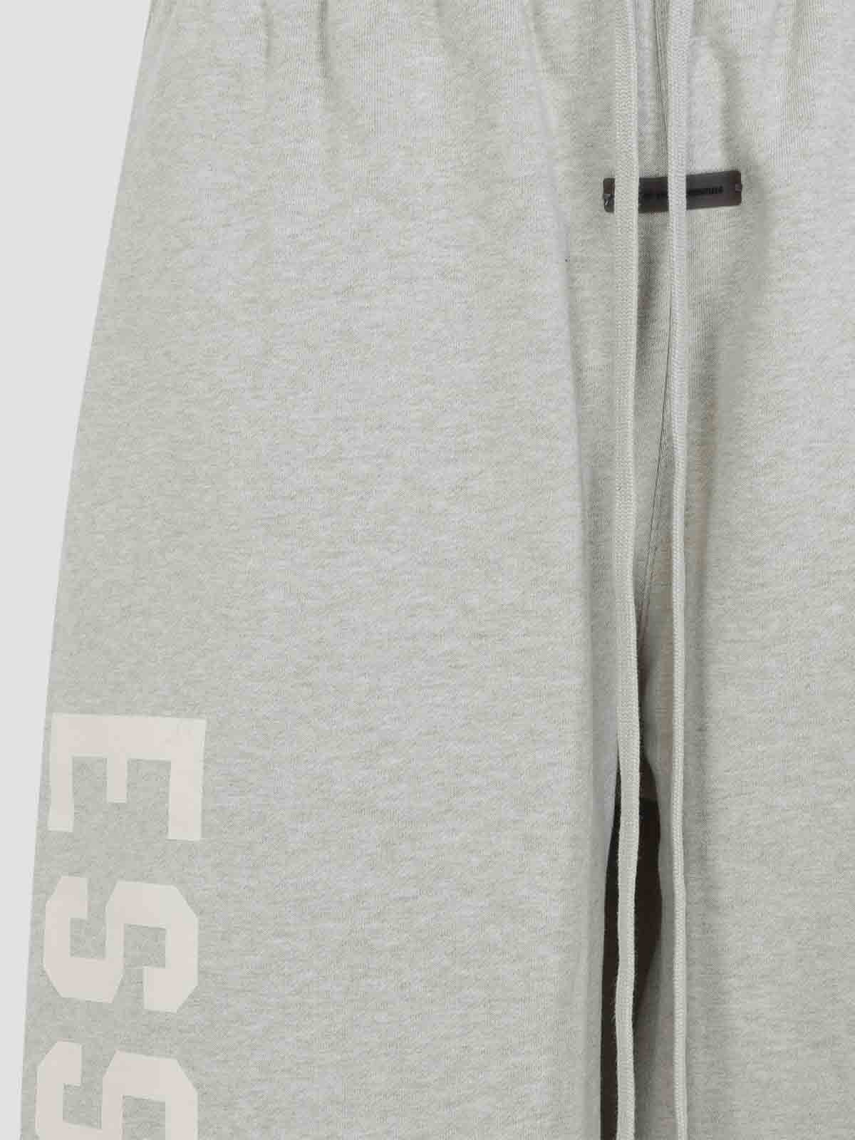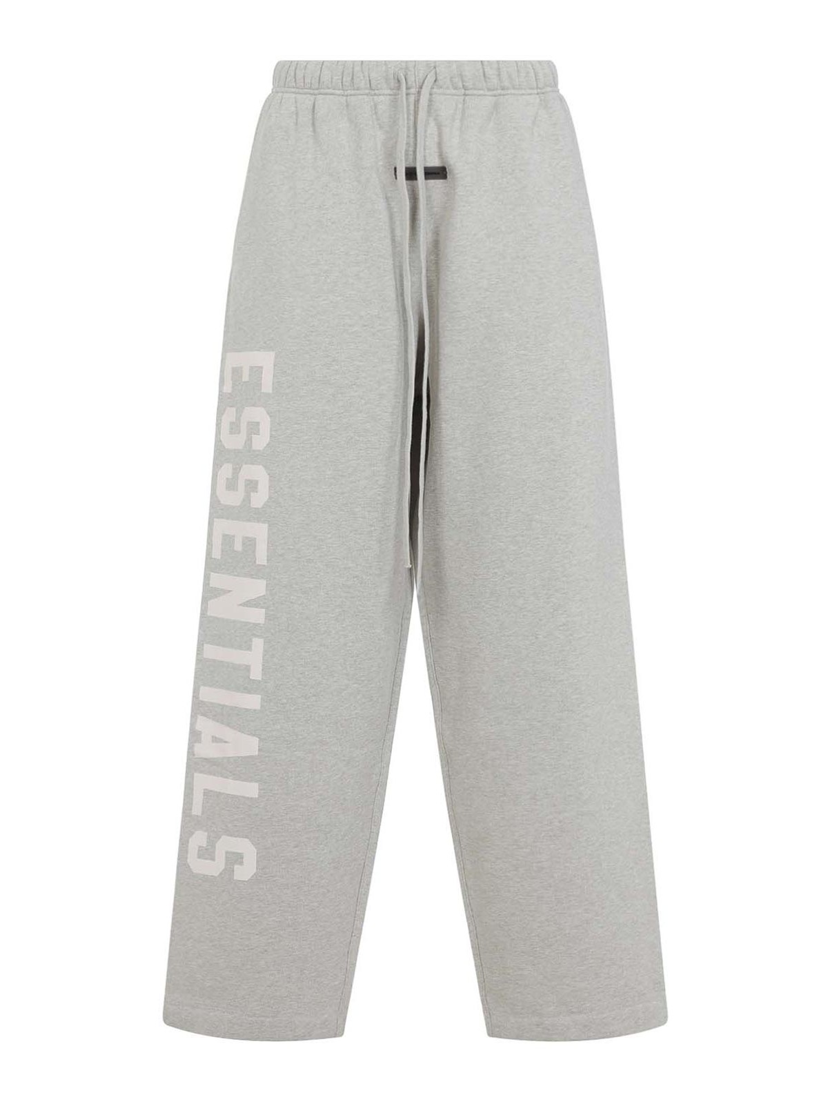 Fear of God Essentials ヘザーストーングレーラウンジフリーススウェットパンツ伸縮性ウエストバンドドローストリングシグネチャーパッチロゴサイドポケットサイドコントラストホワイトレタリングロゴストレートヘム