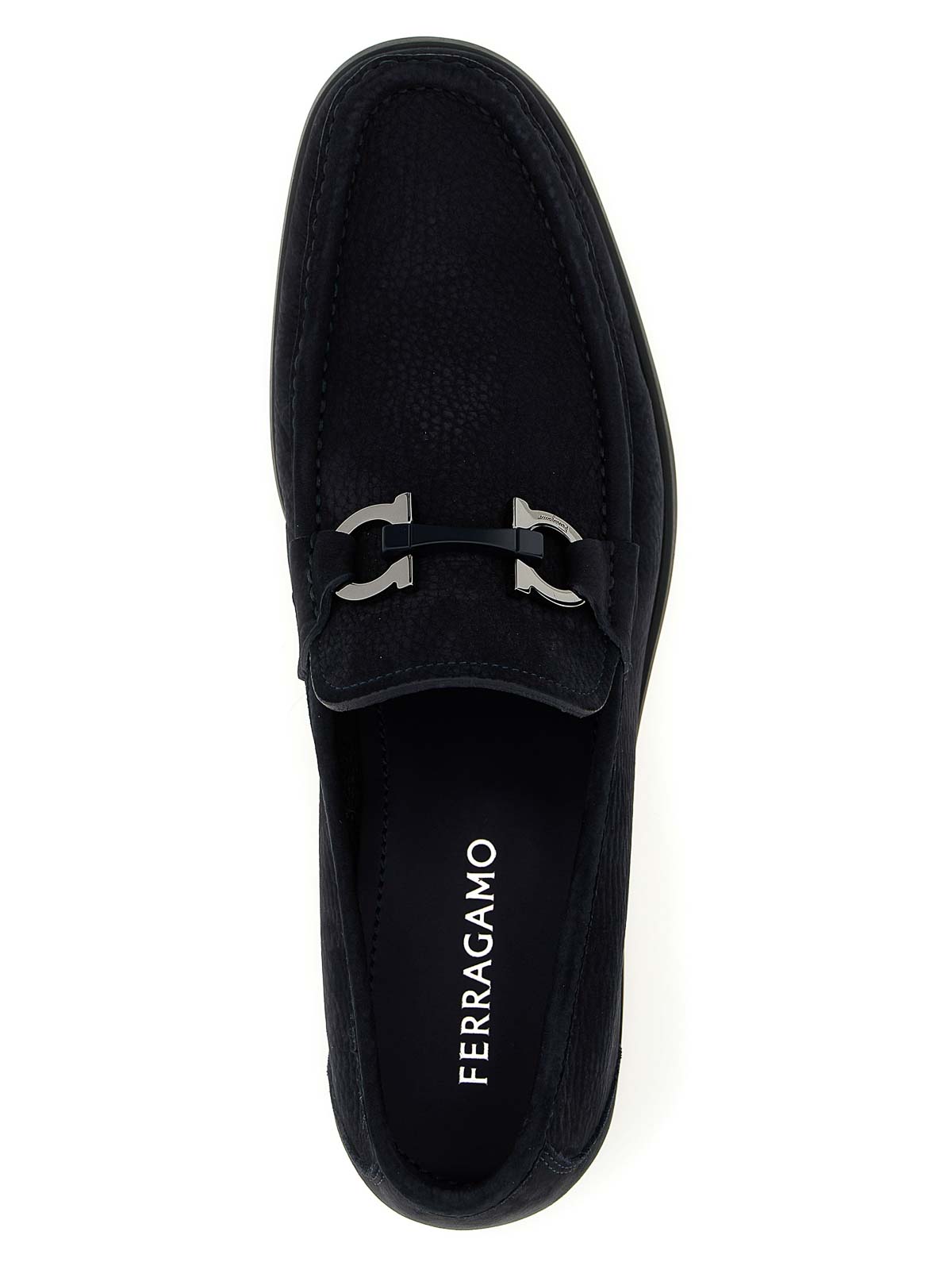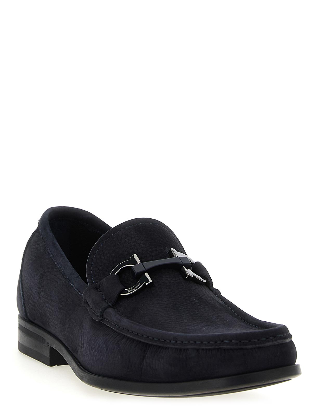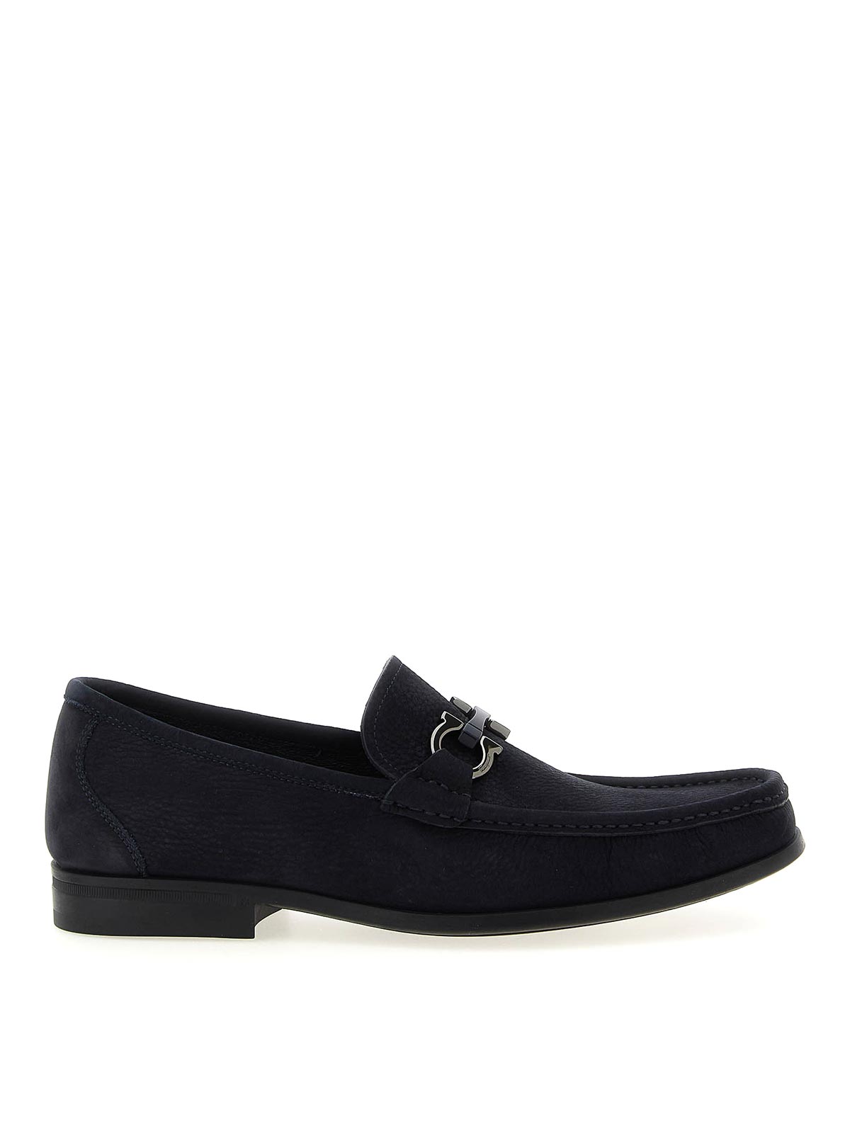 金属製の「ガンチーニ」クランプとフロントステッチトレイを備えたグランディオソのヌバックローファー、チューブラー構造モデル、柔軟なラバーソール。
