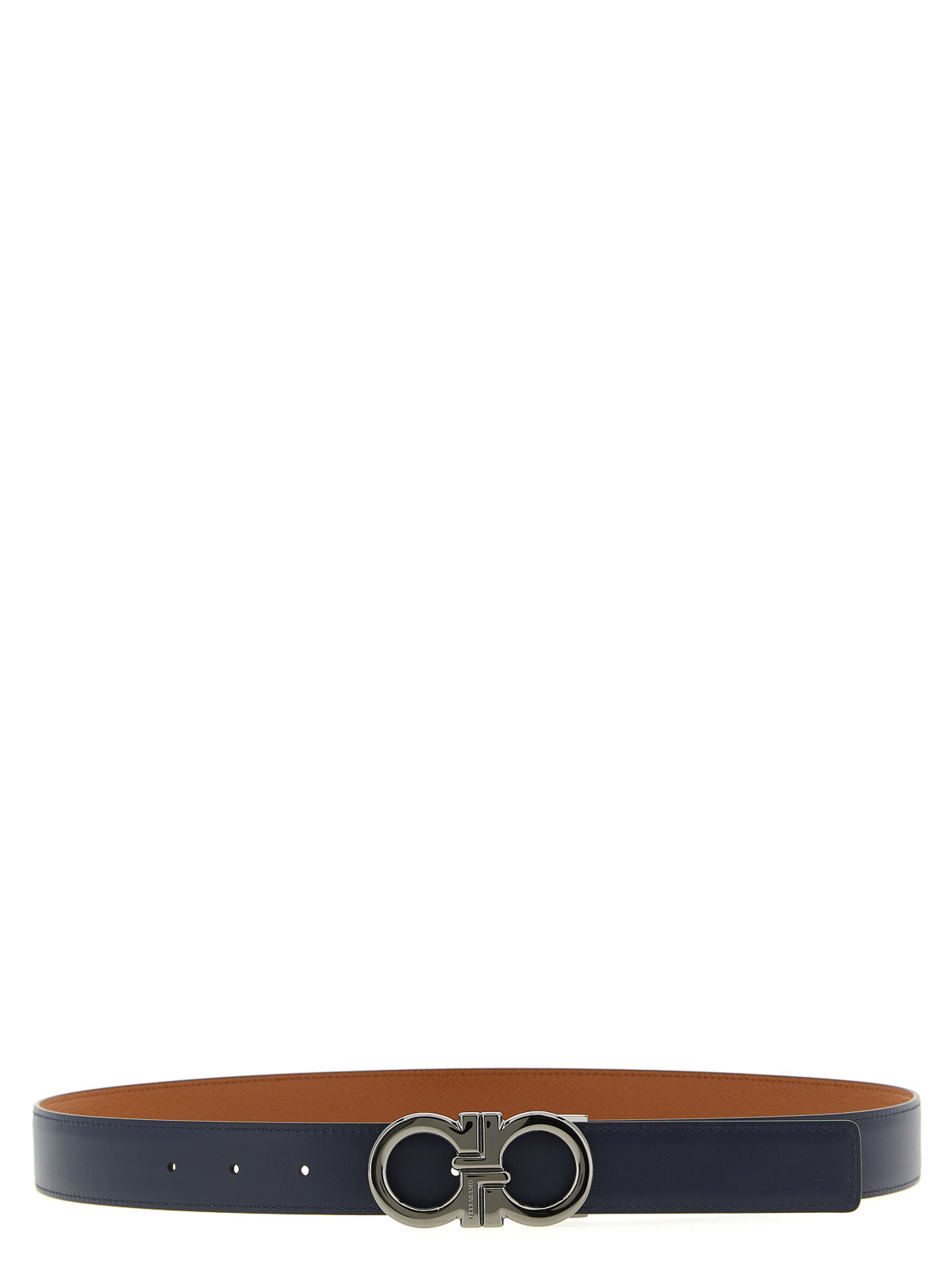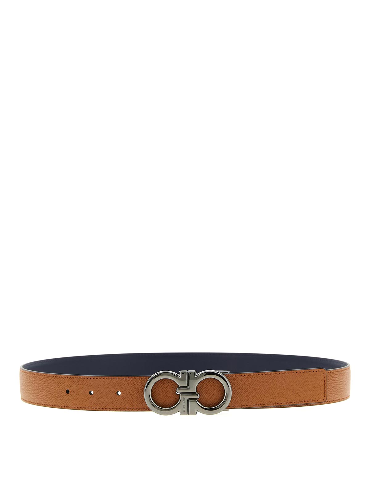 ブラウンとブルーのハンマー加工レザーのリバーシブルベルト、メタルの「ガンチーニ」バックル。