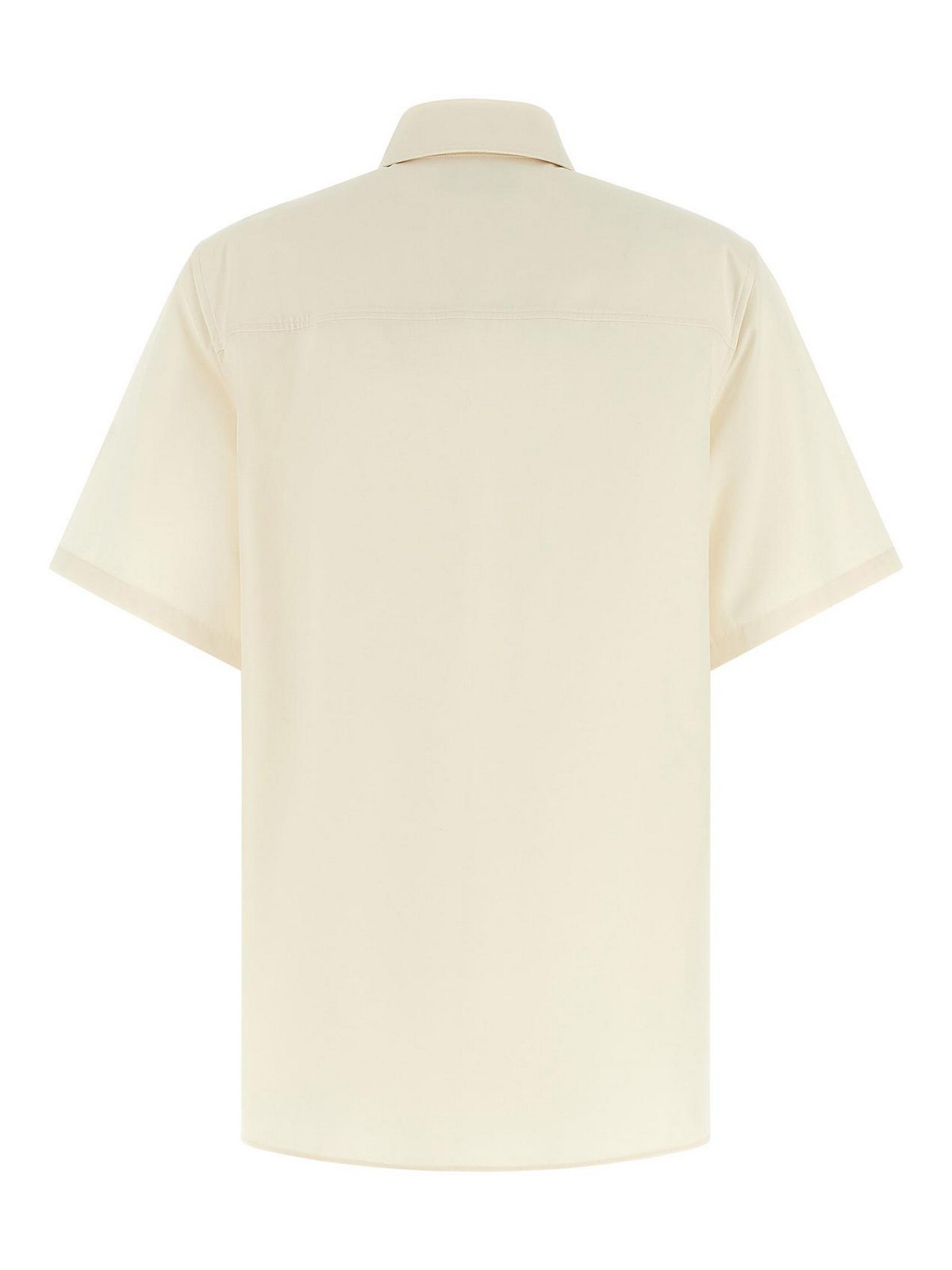 コットンとシルクの混紡シャツ、トーン・オン・トーンの「ガンチーニ」刺繍をあしらった胸ポケット、先のとがった襟、前面にマザー・オブ・パールのボタン留め、ショートスリーブ、サイドスプリット、アシンメトリーヘム。