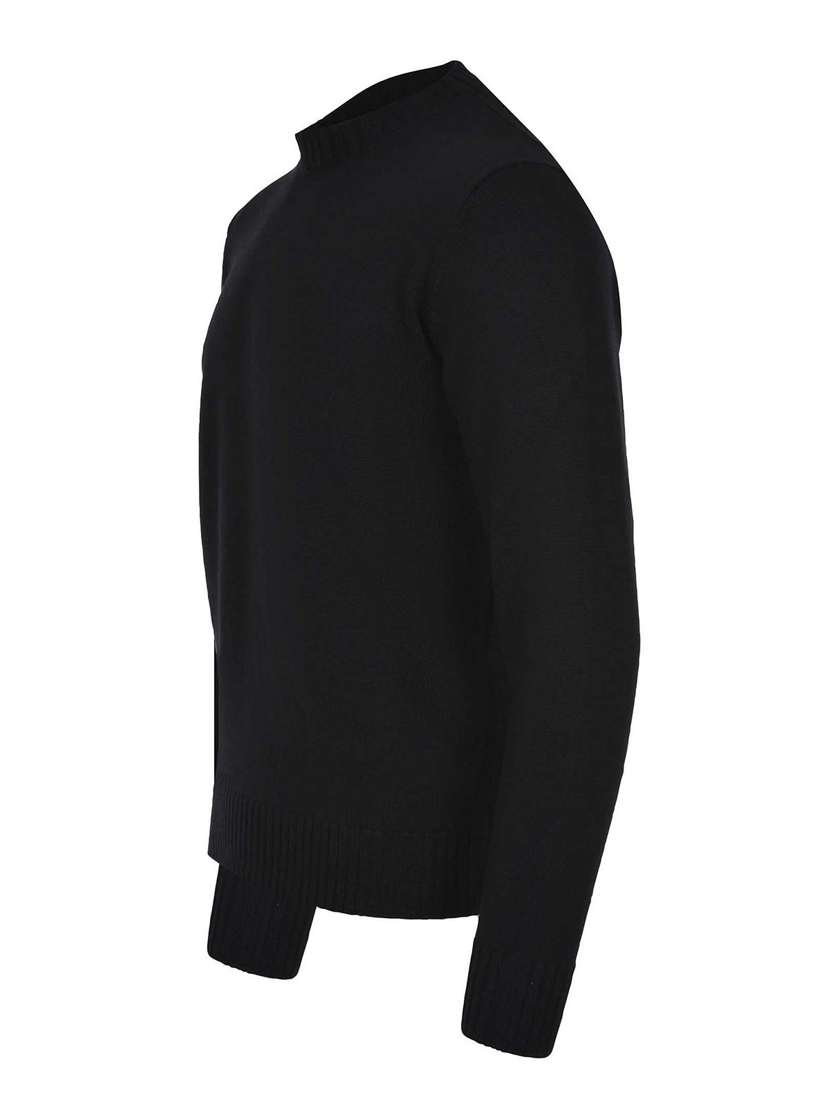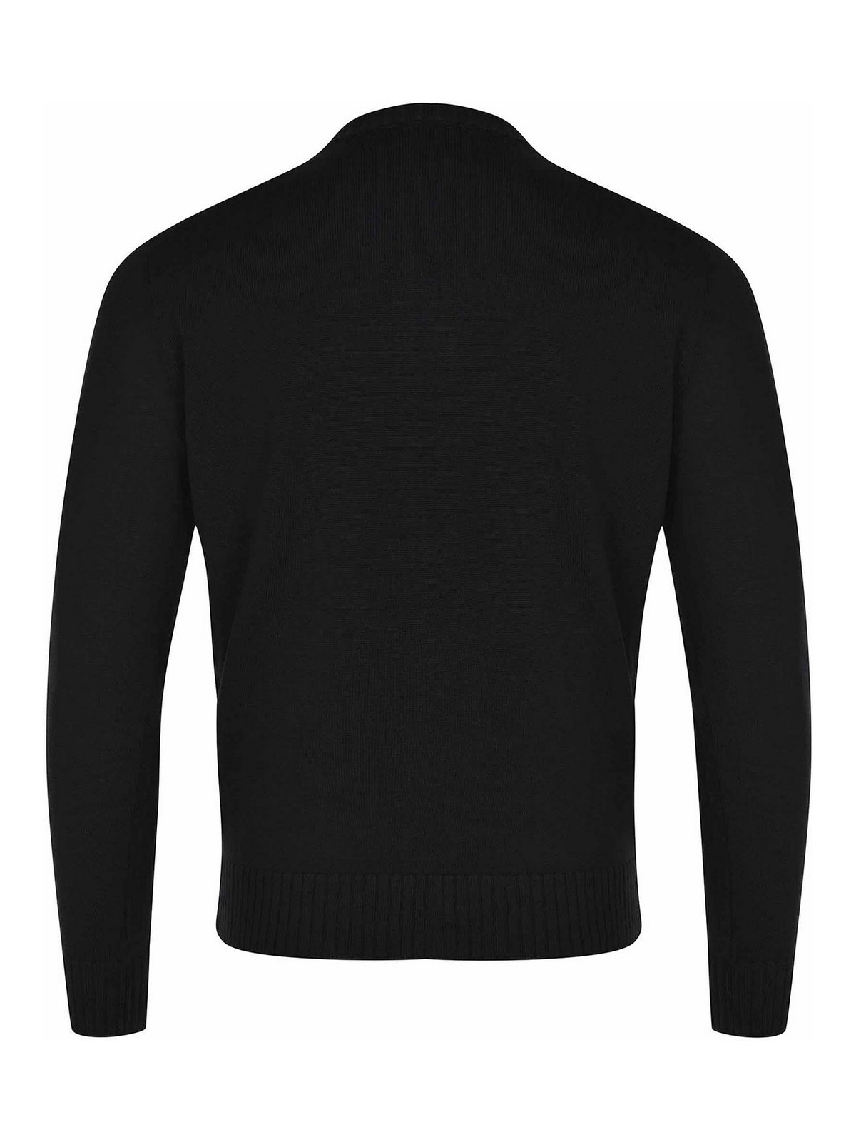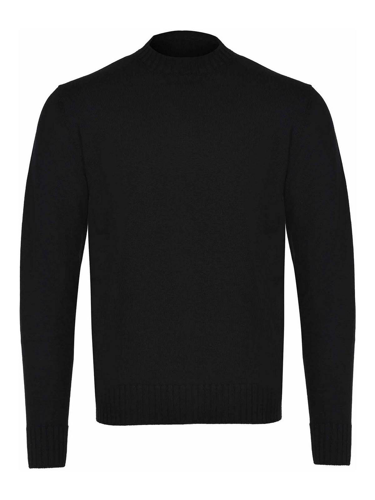 フィリッポ・デ・ラウレンティス製ブラックウールセーター、リブ編みのクルーネック、長袖、袖口と裾はリブ編み、イタリア製メリノウール 100%