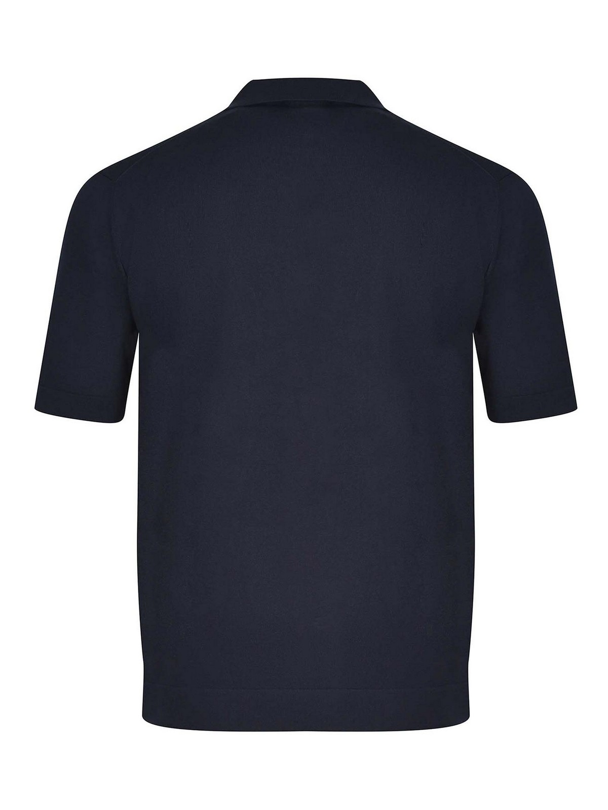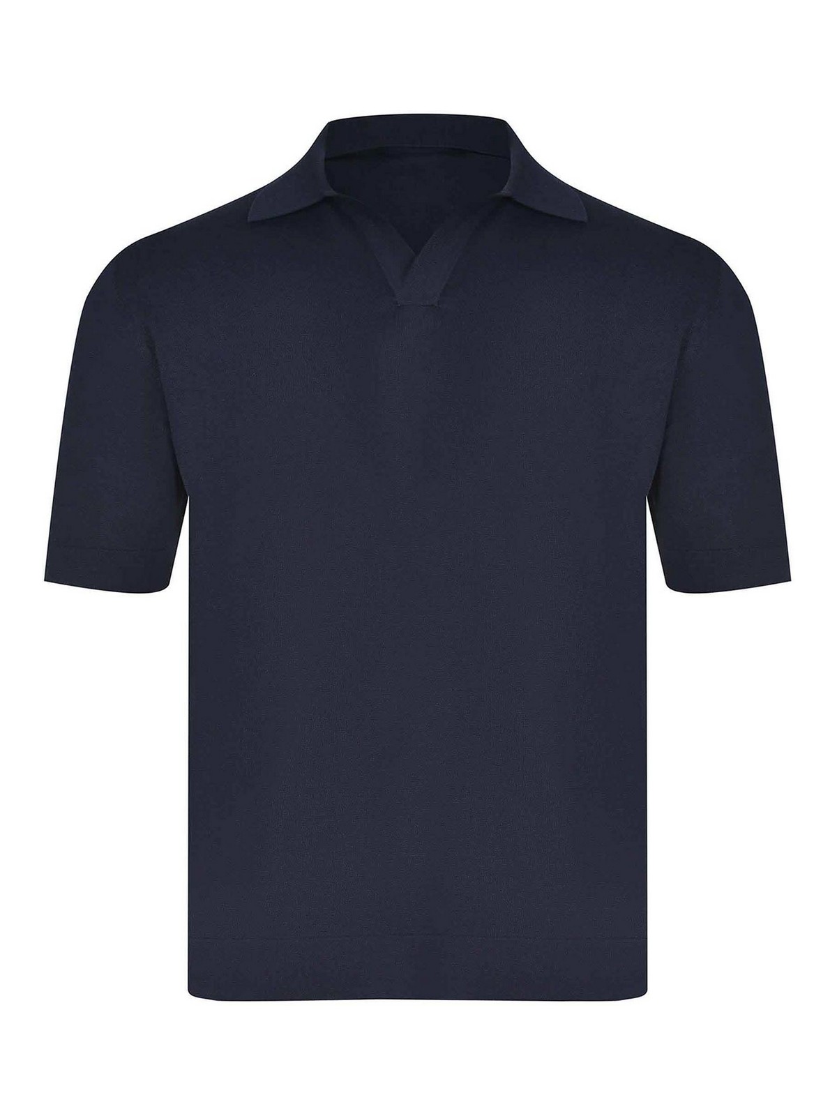 Filippo de laurentiisのポロシャツはナイトブルーコットン製、Vネックのリブ編みの襟、半袖、裾にサイドスリット、イタリア製 100% コットン