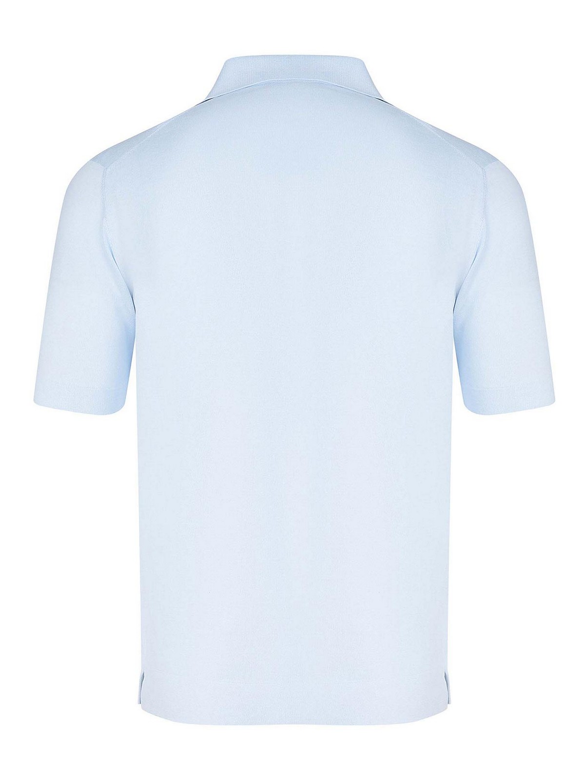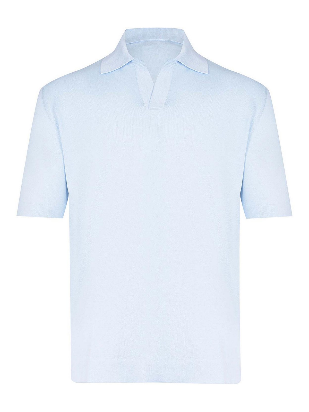 スカイブルーコットン製のフィリッポ・デ・ラウレンティスのポロ、スカイブルーコットン製のフィリッポ・デ・ラウレンティスのポロシャツ、Vネックのリブ編みの襟、半袖、裾にサイドスリット、イタリア製 100% コットン