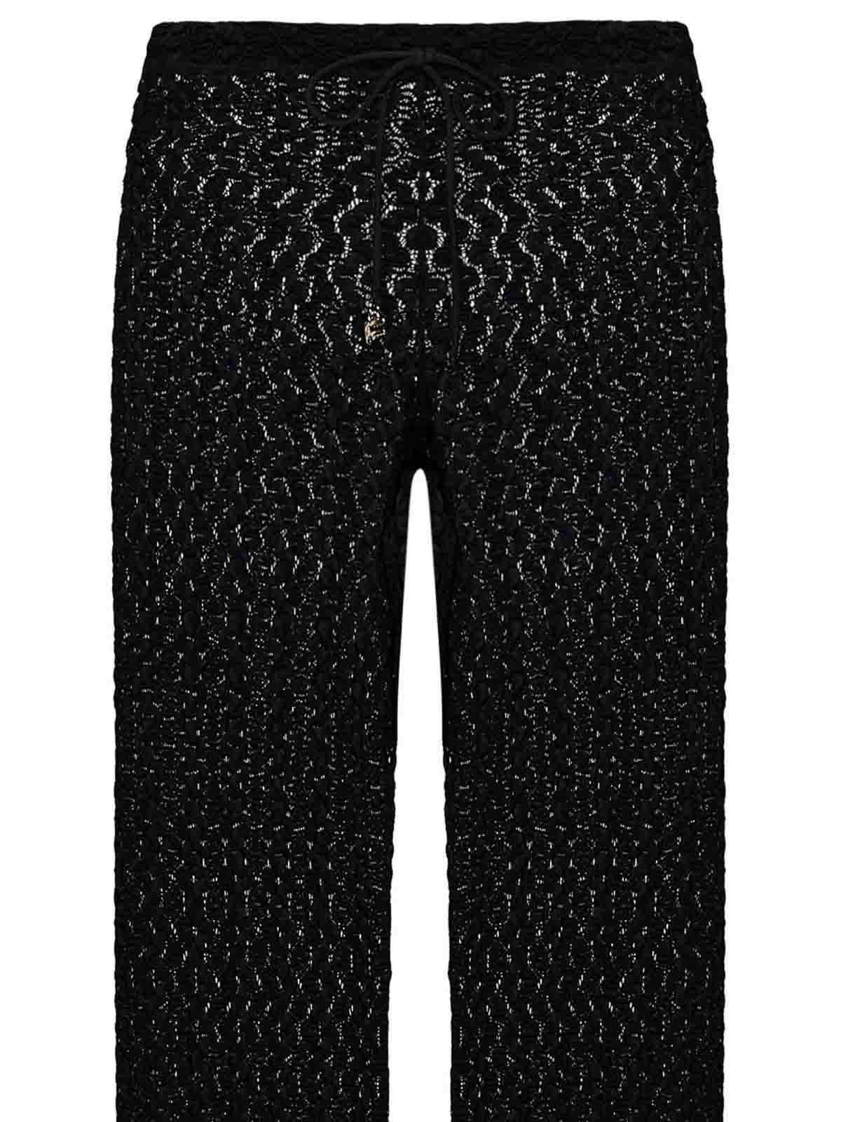 調節可能なローウエスト、端にドローストリング付き、Fロゴ入りセミカラー、透明デザイン、全体に波状のストライプ柄、オーバージャカードストレートレッグカット、ブラックカラー