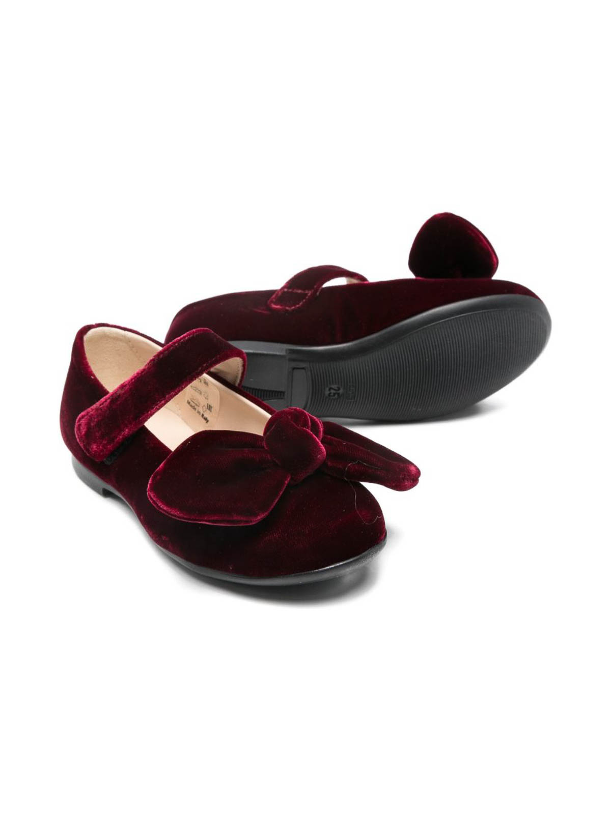 バーガンディの丸いつま先のリボンストラップが特徴のベルベットバレエシューズ