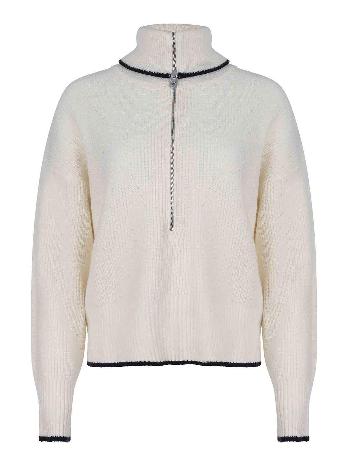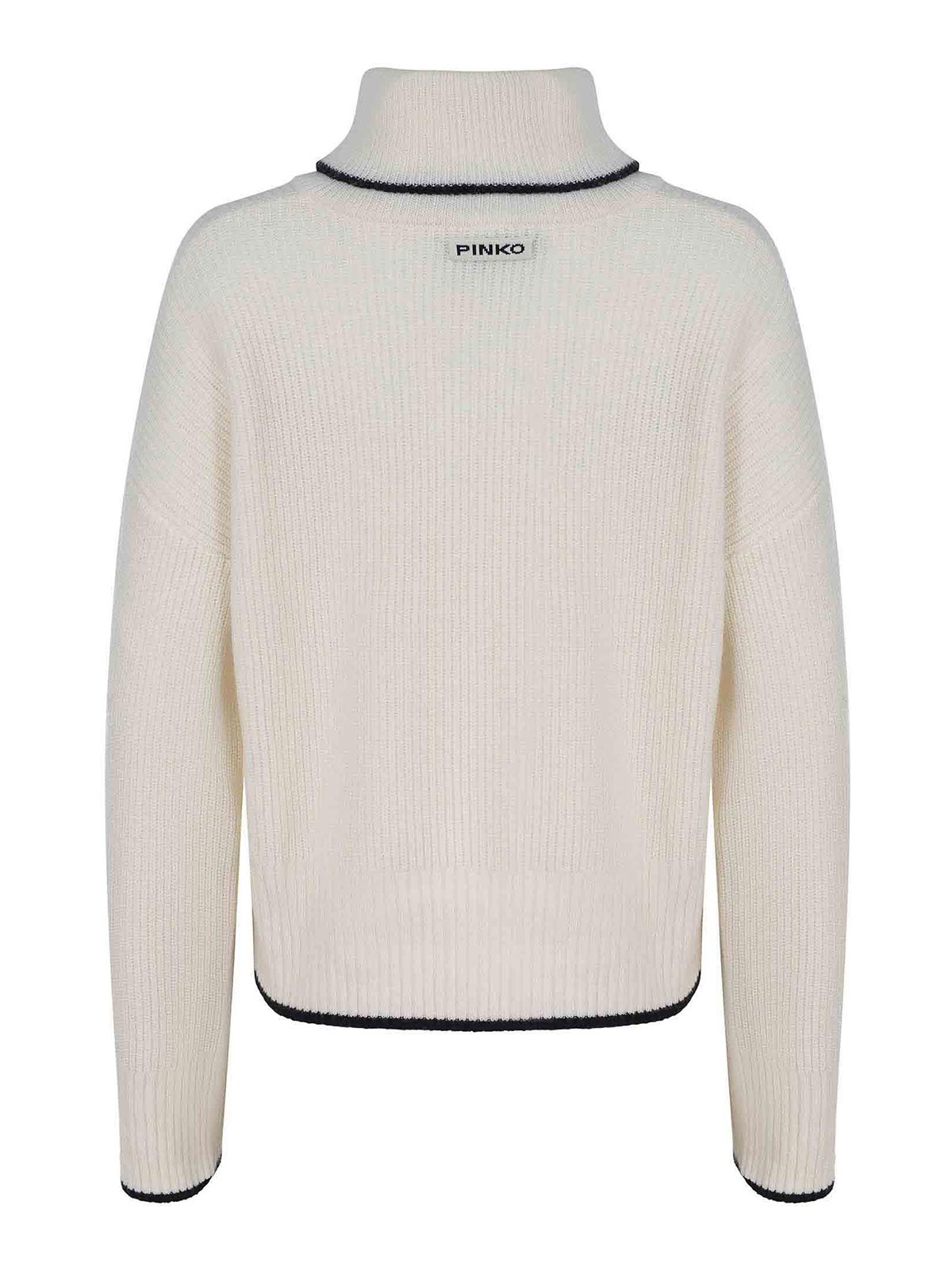 クリーム色のウールとカシミアの混紡で作られたPinkoのフォレガンドロスセーター。リブ編み、ハイネック、チェストジッパー、ロングスリーブ、コントラスト仕上げ。背面にコントラストの効いたロゴラベルの刺繍。ウール 90%、カシミア 10%
