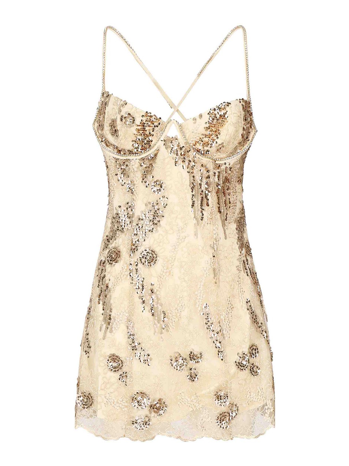 スパンコールレース製、後ろに隠しファスナー付き、背面に十字形のストラップ付き、写真のサイズはXS、色:ゴールド