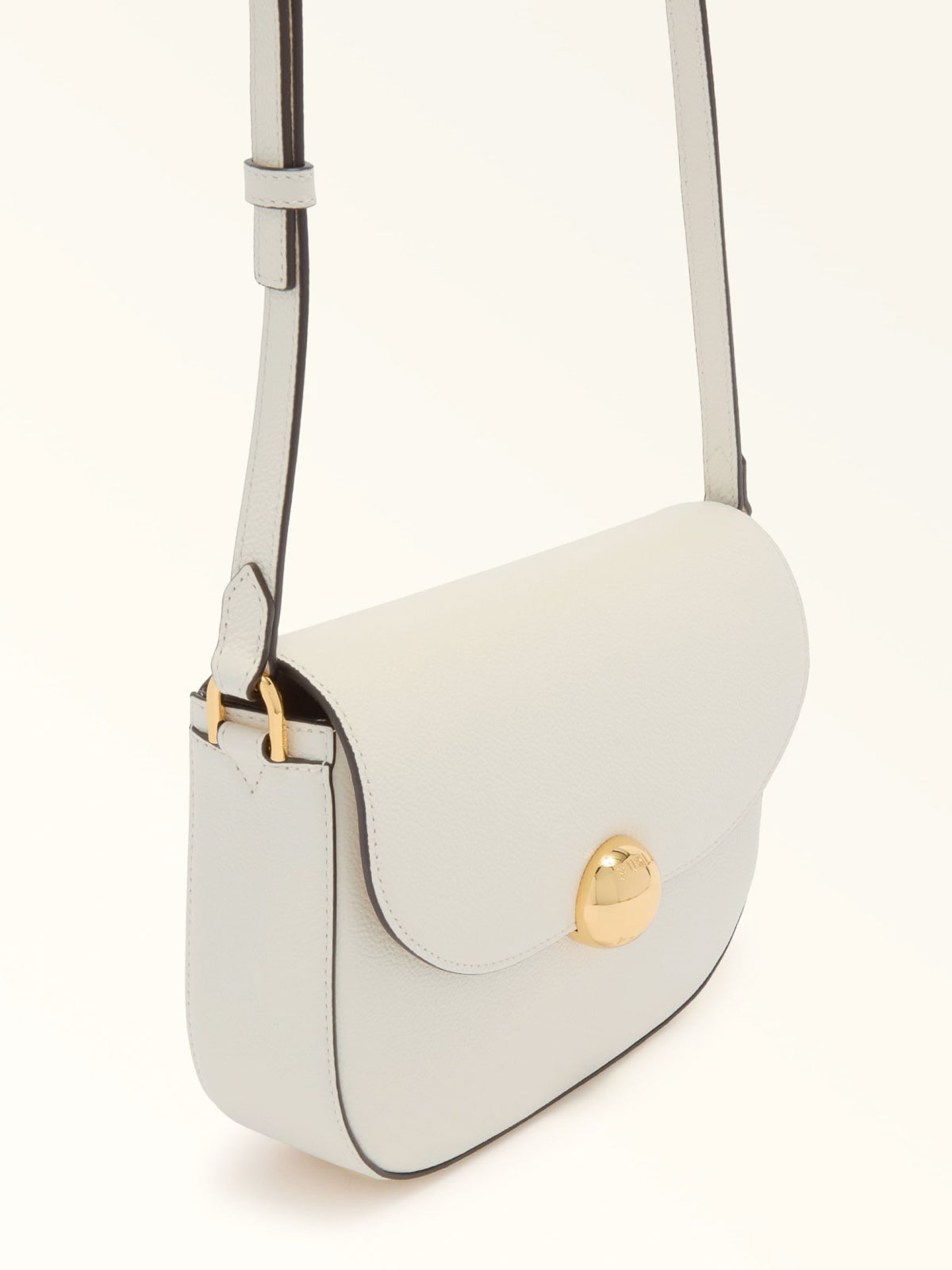 レザーサドルデザインのクロスボディバッグ。柔らかく丸みを帯びたラインのクロスボディバッグ。アイコニックな球体のロゴが飾られたマグネットボタン付きのフラップ。調節可能なジッパー付きの内ポケット1つ。フルラのロゴがプリントされたコンポジションの最大長