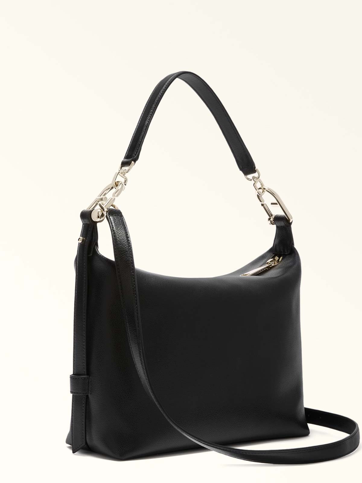質感のある仕上げのレザー製ホーボーバッグ、シングルコンパートメント、調節・取り外し可能なコンパートメントは、アイコニックなアルコ・フルラのロゴを組み合わせたarcosferaハードウェアの新しい解釈が特徴です。ジッパー付きの内ポケット1つ、内部スロットポケット1つ、背面にフルラのロゴが打ち込まれたジッパーを調整できるサイドマッシュルームボタン、取り外し可能で調節可能なバッグの最大長