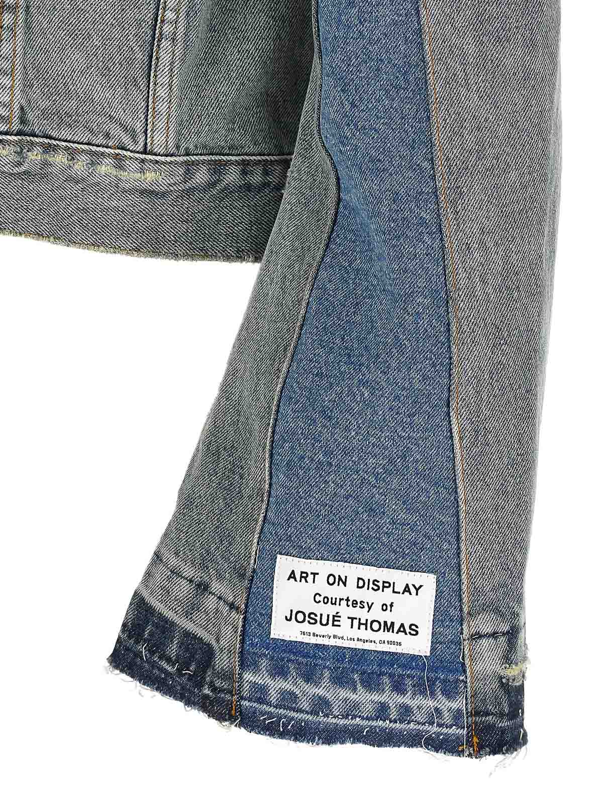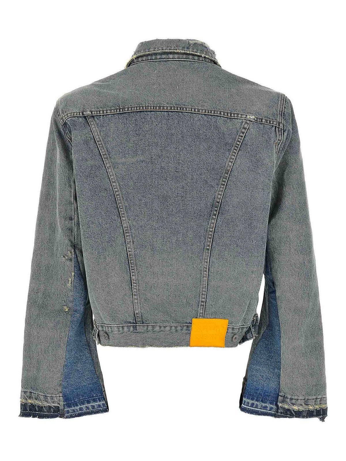 リップ付きユーズドエフェクトコットンデニムのフォードトラッカージャケット、シャツカラー、フロントボタンクロージャー、ポケット、予備パッド入りショルダーストラップ、パッチワーク構造のロングワイドフレアスリーブ、バックレザーロゴタグ。