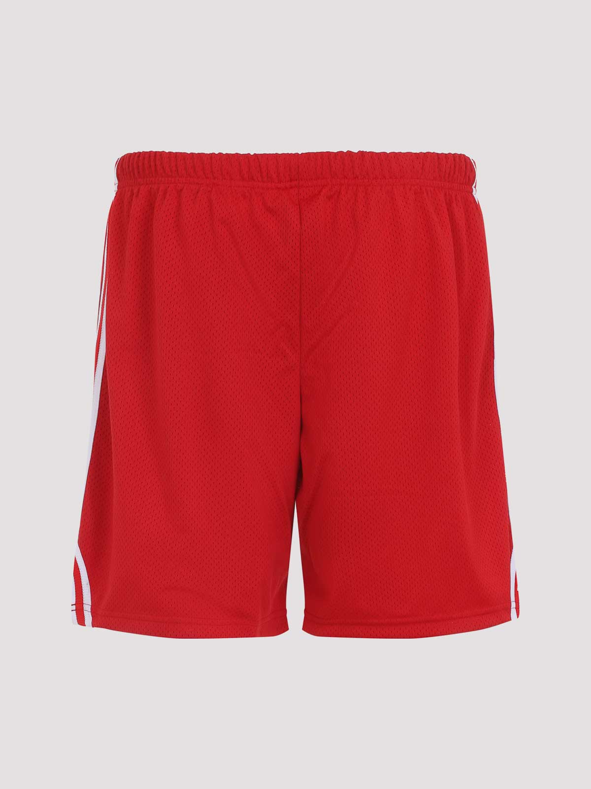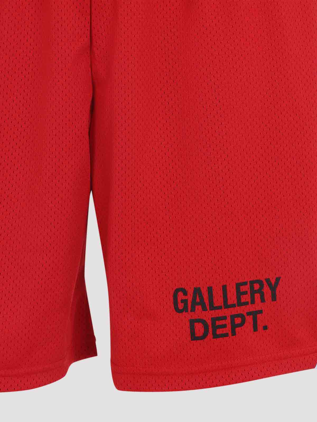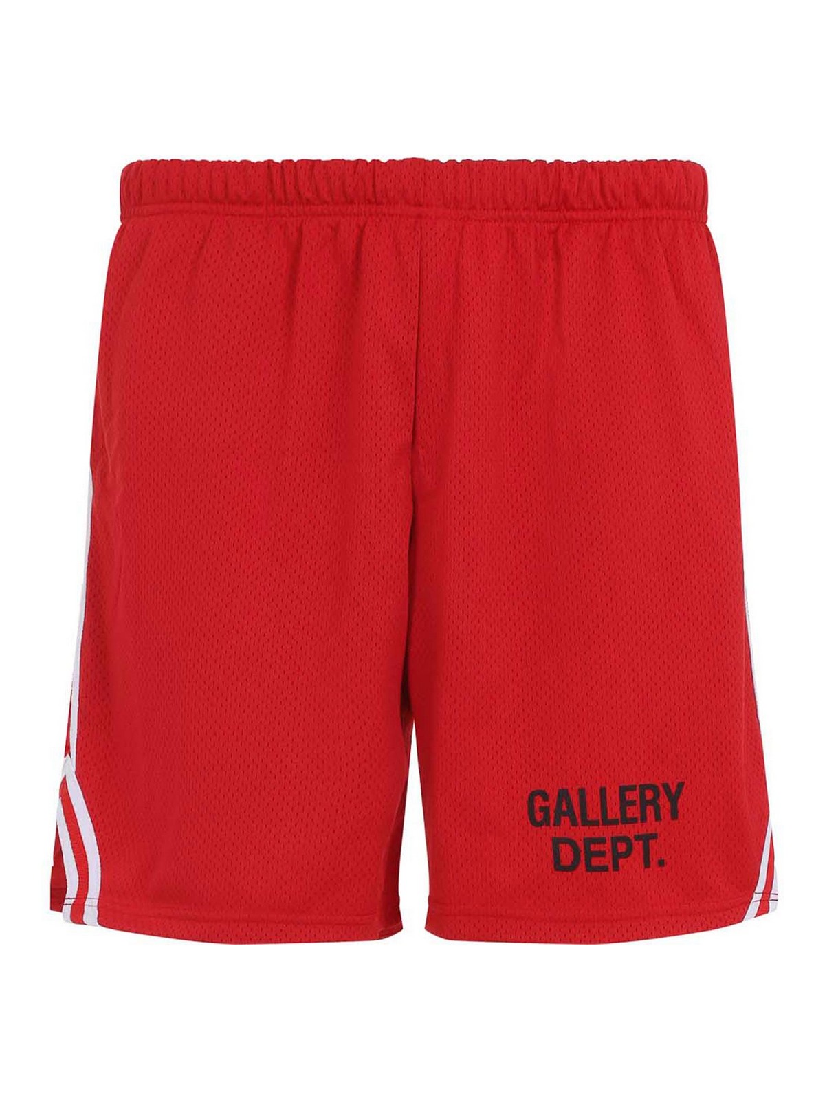 ギャラリーデパートのレッドベニスコートショーツ。ポリエステル生地製。伸縮性のあるウエストバンド、サイドポケット、サイドホワイトバンド、サイドコントラストカラーのブラックレタリングロゴ、穴あきディテール、ストレートヘム。