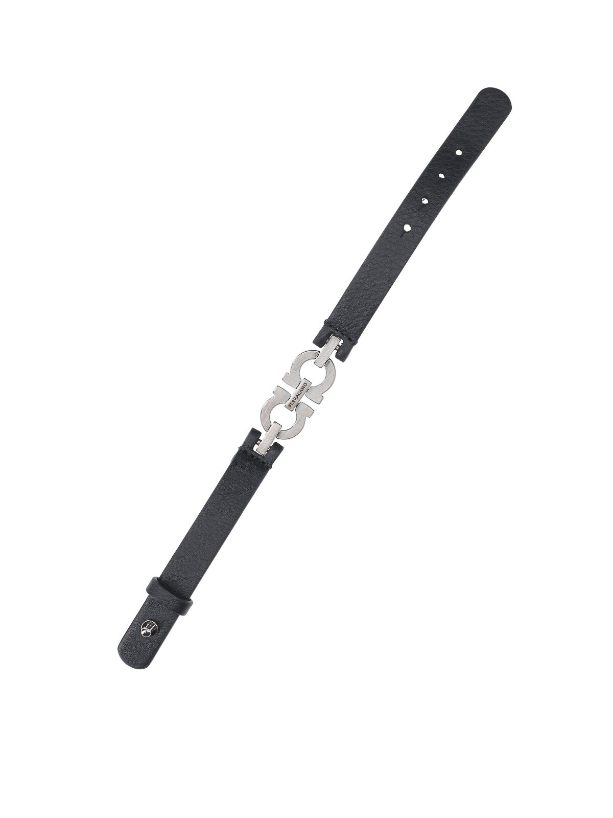 ブラックカーフスキンのフェラガモガンチーニブレスレット、前面にシルバーメタルのガンチーニロゴ、刻印入りロゴディテール、調節可能なピンクロージャー。