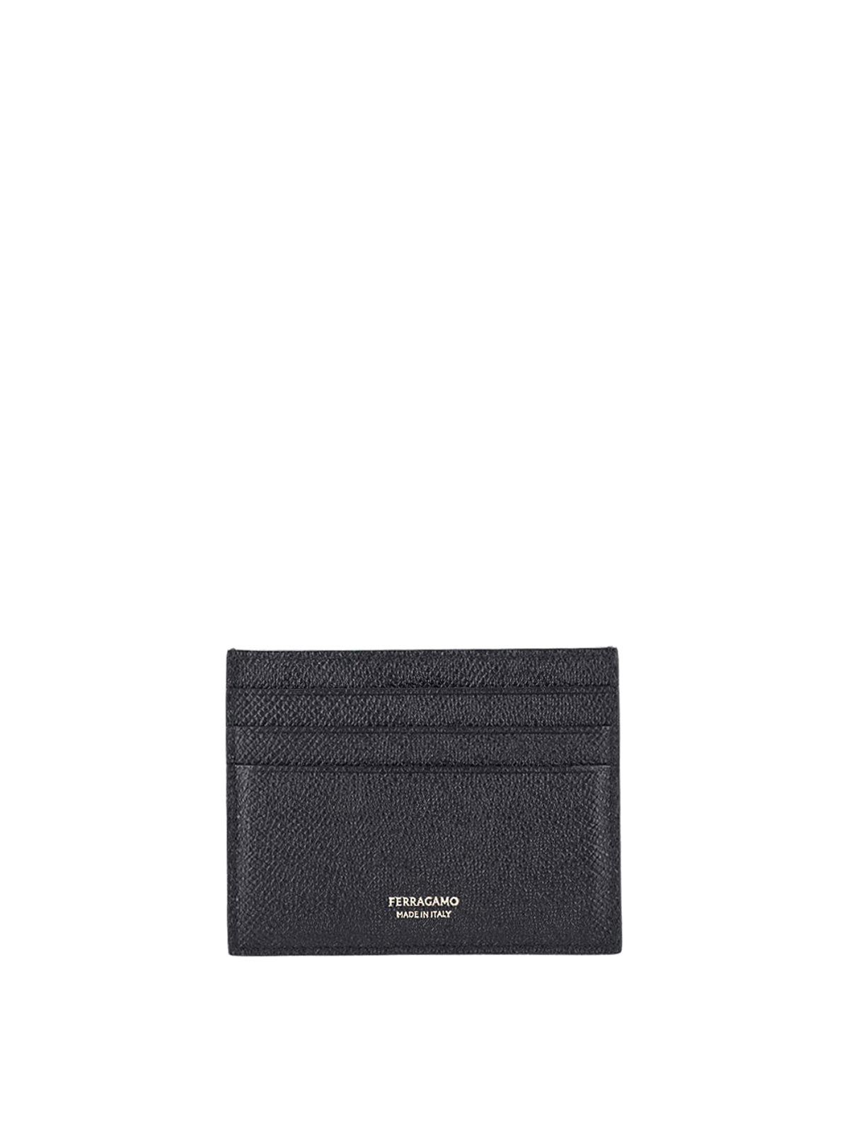 ブラックの質感のカーフスキン製フェラガモ・ガンチーニカードホルダー、フラットトップポケット1つ、前面と背面にカードスロット6つ、前面に金色のメタルロゴ、背面に金色のロゴエンボス加工
