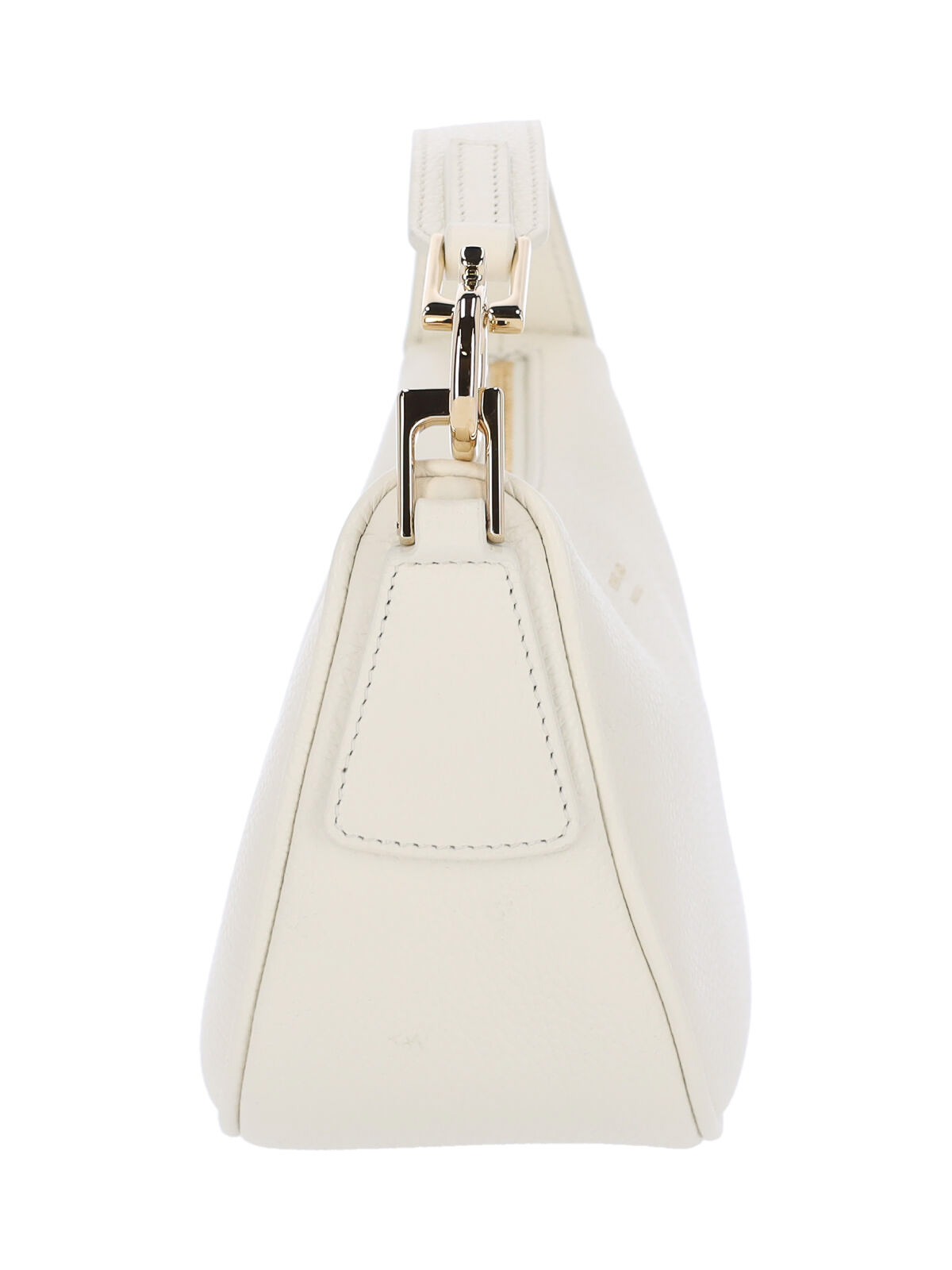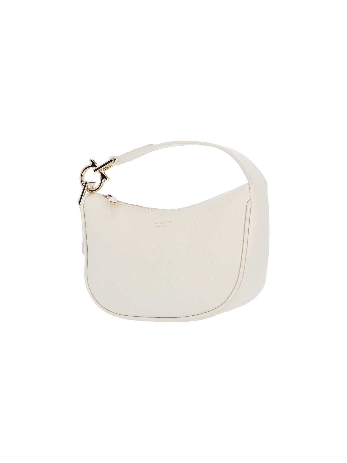 ホワイトカーフスキンのフェラガモミニホーボーバッグ、トップハンドル1つ、ファスナー開閉、ゴールドメタルのガンチーニディテール、メイン内部コンパートメント1つ。