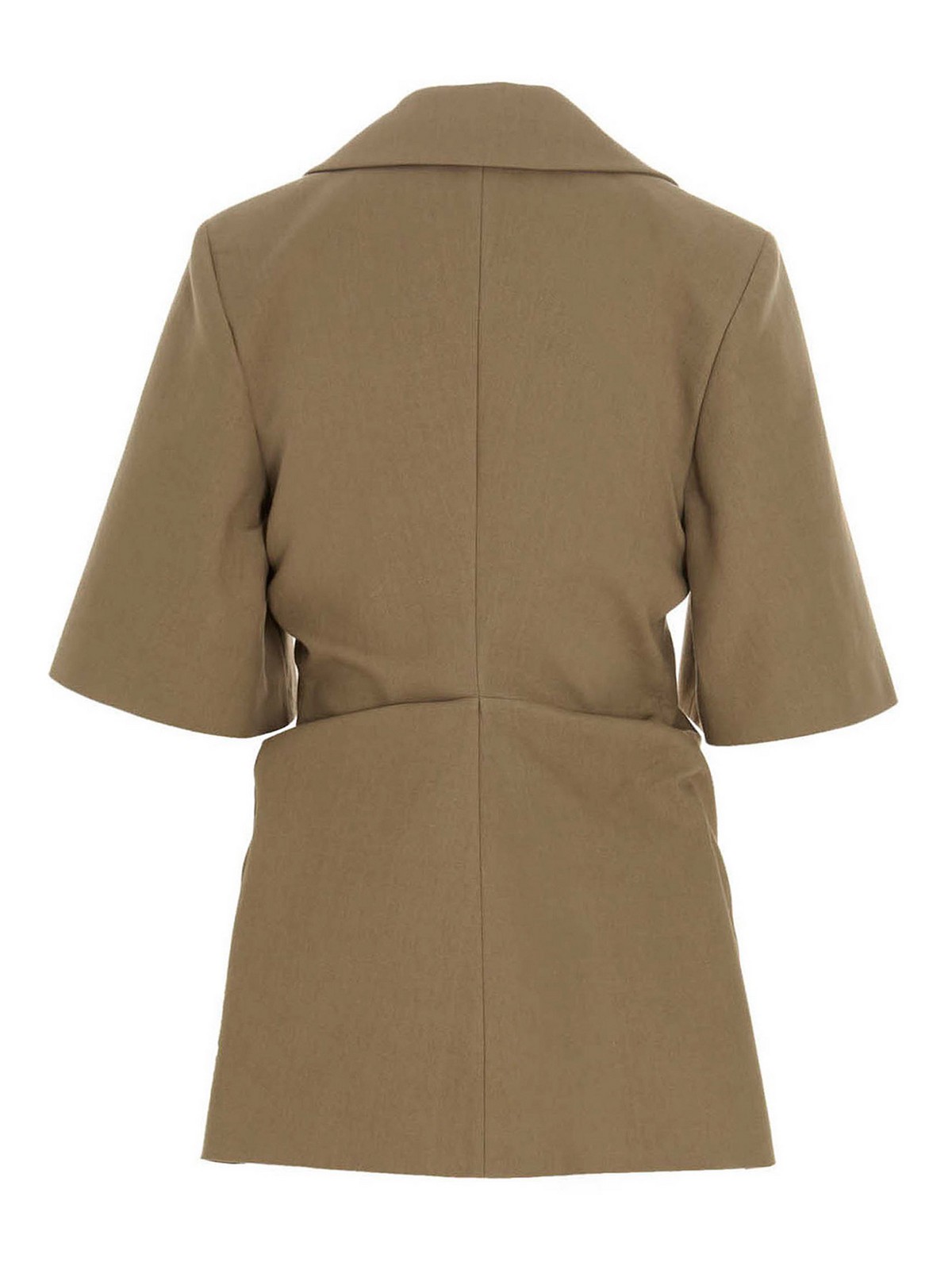シングルブレストの半袖コットンジャケット、折り返しデザインのボタン留め、パッド入りの肩、ポケット、サイドにしわが寄っています。