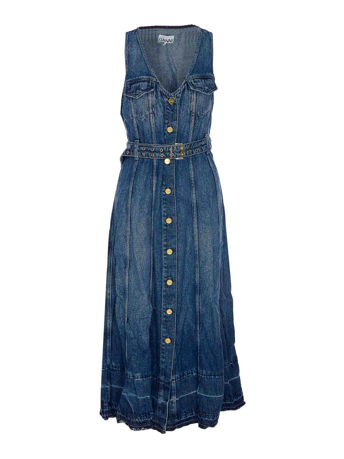 デニムライトデニムベルトドレスボタンベルト Vネックノースリーブミディモデル